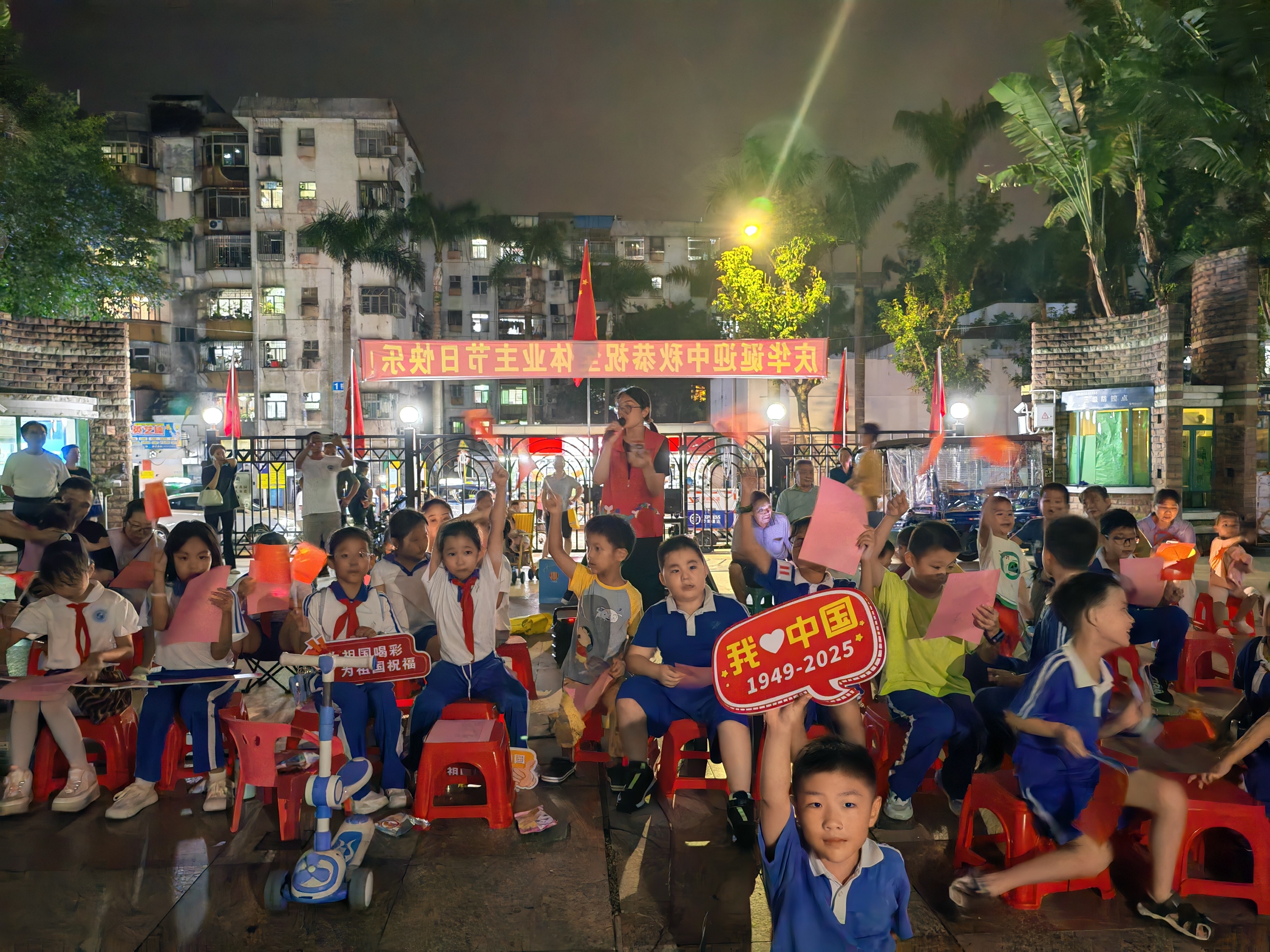 “我和我的祖国,一刻也不能分割......”傍晚6时30分,在社工的带领下,广场上响起了嘹亮而此起彼伏的歌声。大人小孩们挥舞着手中红色的小国旗,路过的居民也纷纷驻足哼唱着这首耳熟能详的歌曲。人群中,老党员陈姨由衷地说:“这首歌让我想起过去在学校听广播的时光,现在和孙子一起唱,感觉特别温暖。”