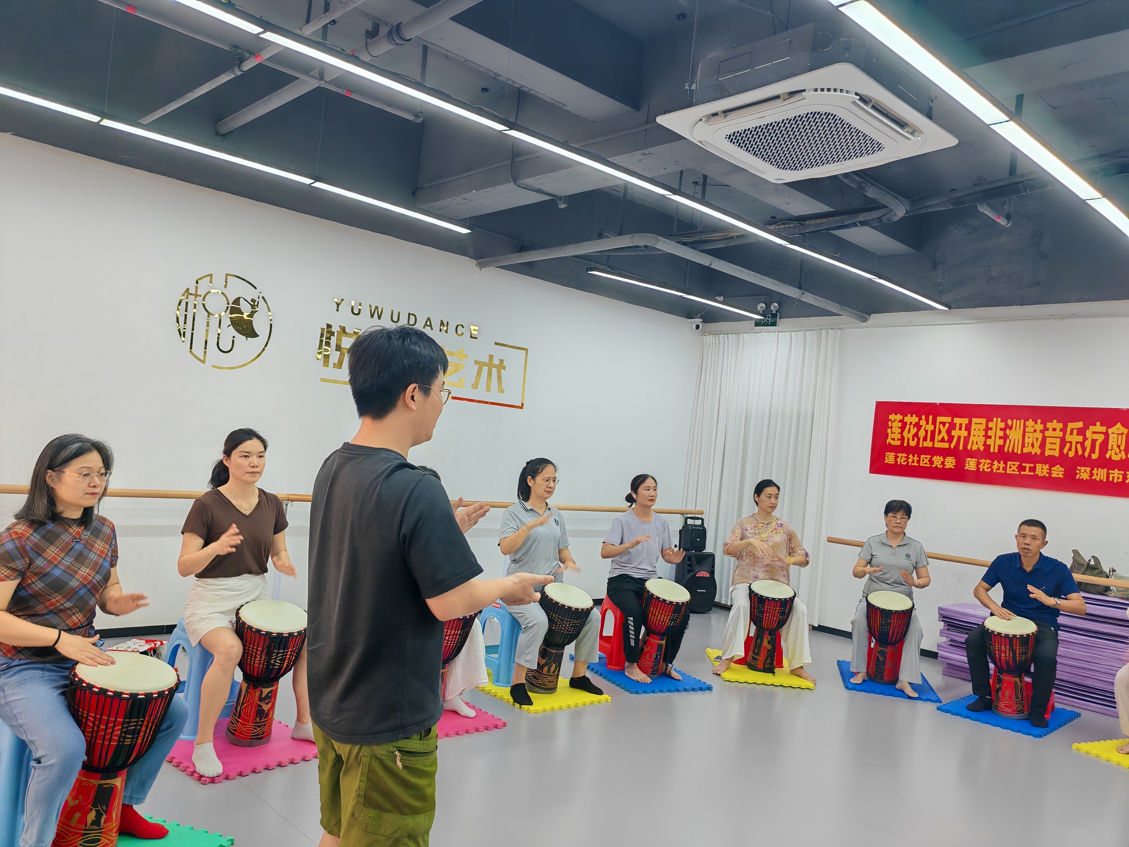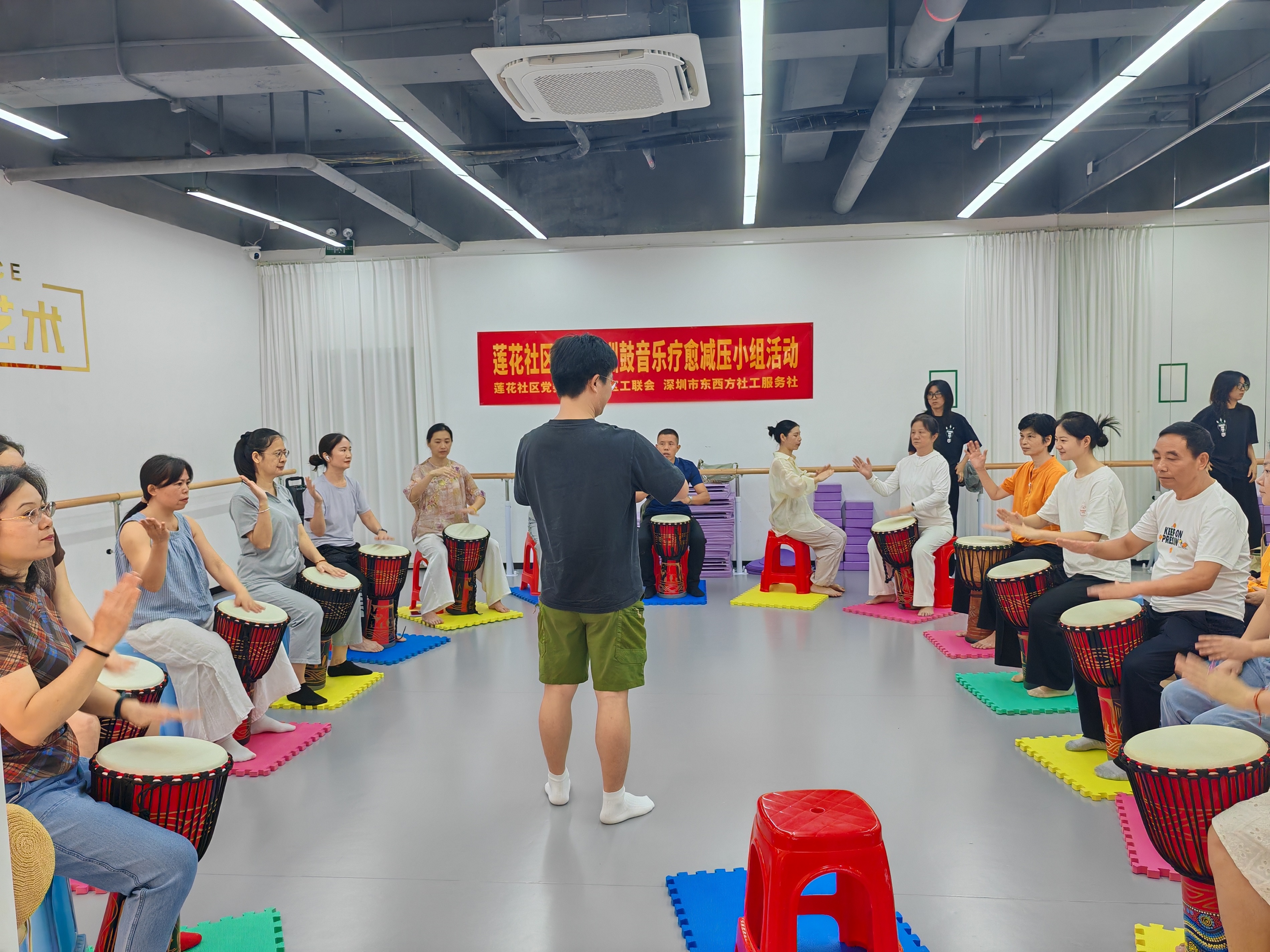 罗湖家园网讯:2025年10月15日上午,莲花社区党委联合深圳市东西方社工服务社、莲花社区工联会,以“乐动人心,鼓舞飞扬”为主题,共同推出了“非洲鼓音乐疗愈减压小组活动”。此次公益班为期12周,每周三上午准时开课,旨在借助鼓乐疗愈的力量,为社区居民搭建一个减压赋能、促进身心健康、增进邻里交流的平台。