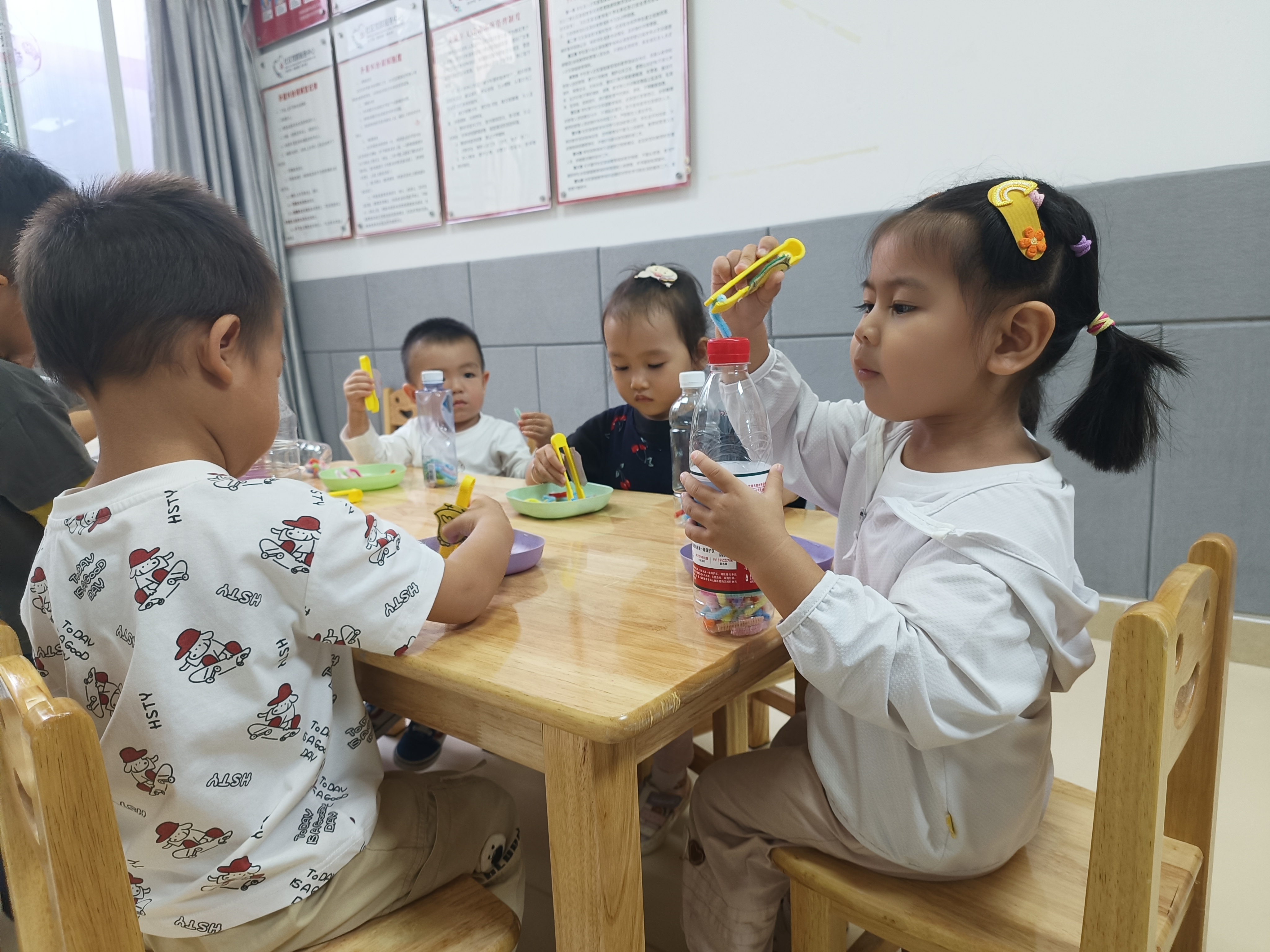 活动的重头戏——“抓虫子”环节精彩上演。石社工用生动的比喻,耐心演示三指捏的动作要领:“看,要像小螃蟹的钳子一样,轻轻捏住毛毛虫。”三指捏虽看似简单,却是宝宝书写能力和生活自理能力的重要基础。起初,毛毛虫在宝贝们的小手中有些“调皮”,不太听话。但孩子们没有放弃,在老师和家长的鼓励下,一次次勇敢尝试。每一次失败,他们都重新振作;每一次成功,脸上都洋溢着自豪的笑容。渐渐地,彩色的毛毛虫一条条被装进瓶子,每一条都见证着孩子们克服挑战的勇气。