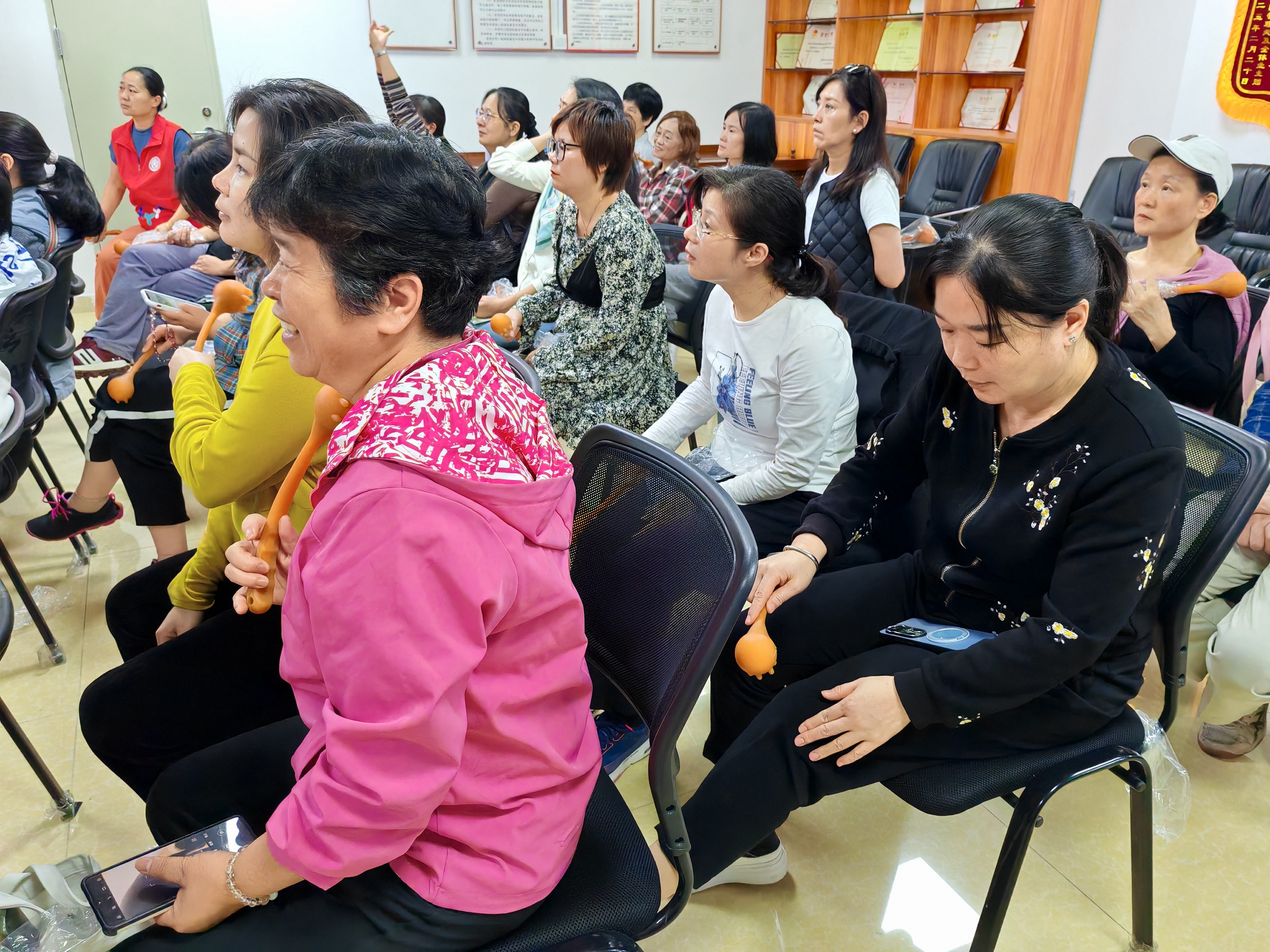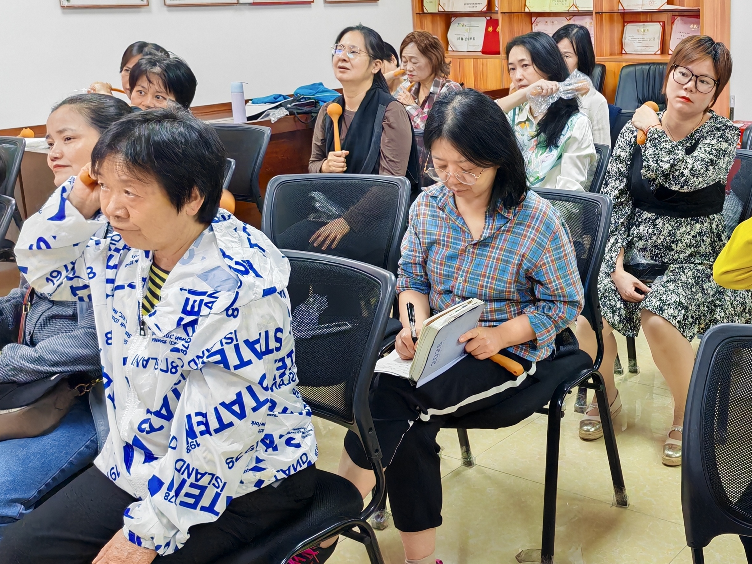 活动伊始,崔老师以通俗易懂的语言,结合图文演示,向居民系统介绍了居家锤疗的历史渊源、原理、功效及适用范围。紧接着,崔老师采用“理论 + 实操”的方式,详细演示了传统锤疗的操作手法。他着重强调了锤疗“轻敲通络、柔化筋结”的作用,有效破除了居民们对传统养生技法的认知误区。台下的居民们全神贯注,有的认真拿笔记录穴位位置,有的赶忙用手机拍下知识要点,生怕遗漏任何重要信息。