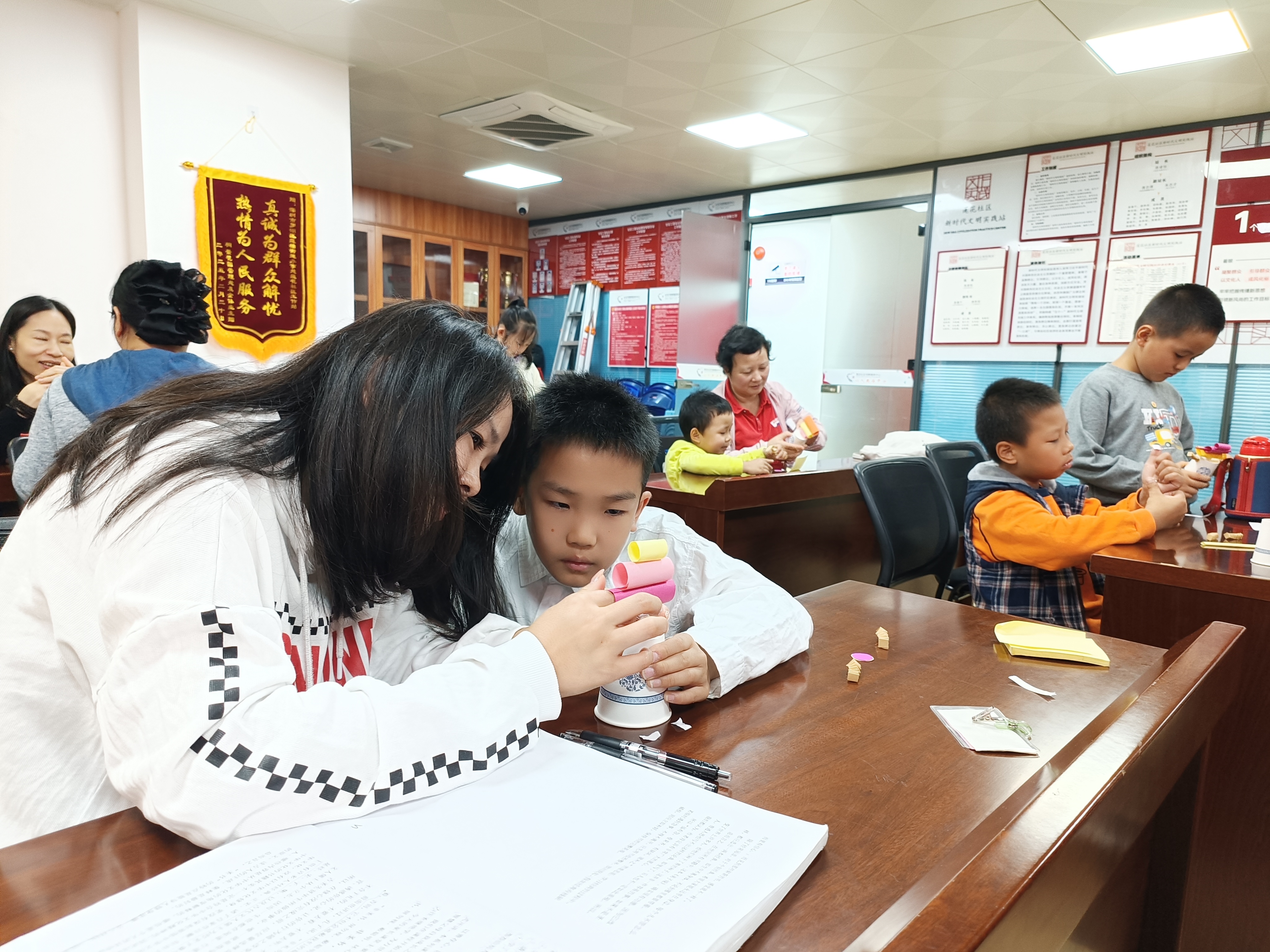 欢乐氛围中,亲子们迎来本次活动的重头戏——财神手工制作。杨社工耐心讲解制作方法、技巧和步骤,从纸张折叠到粘贴装饰,每个细节都清晰明了。志愿者们随后将材料包和工具分发到孩子们手中。孩子们迫不及待,拿到材料便和家长一起动手。他们小心翼翼折出财神形状,再用胶水仔细粘贴,专注认真的模样十分可爱。不一会儿,一个个栩栩如生的财神初具雏形。孩子们兴奋地高举作品展示,脸上洋溢着满足开心的笑容。