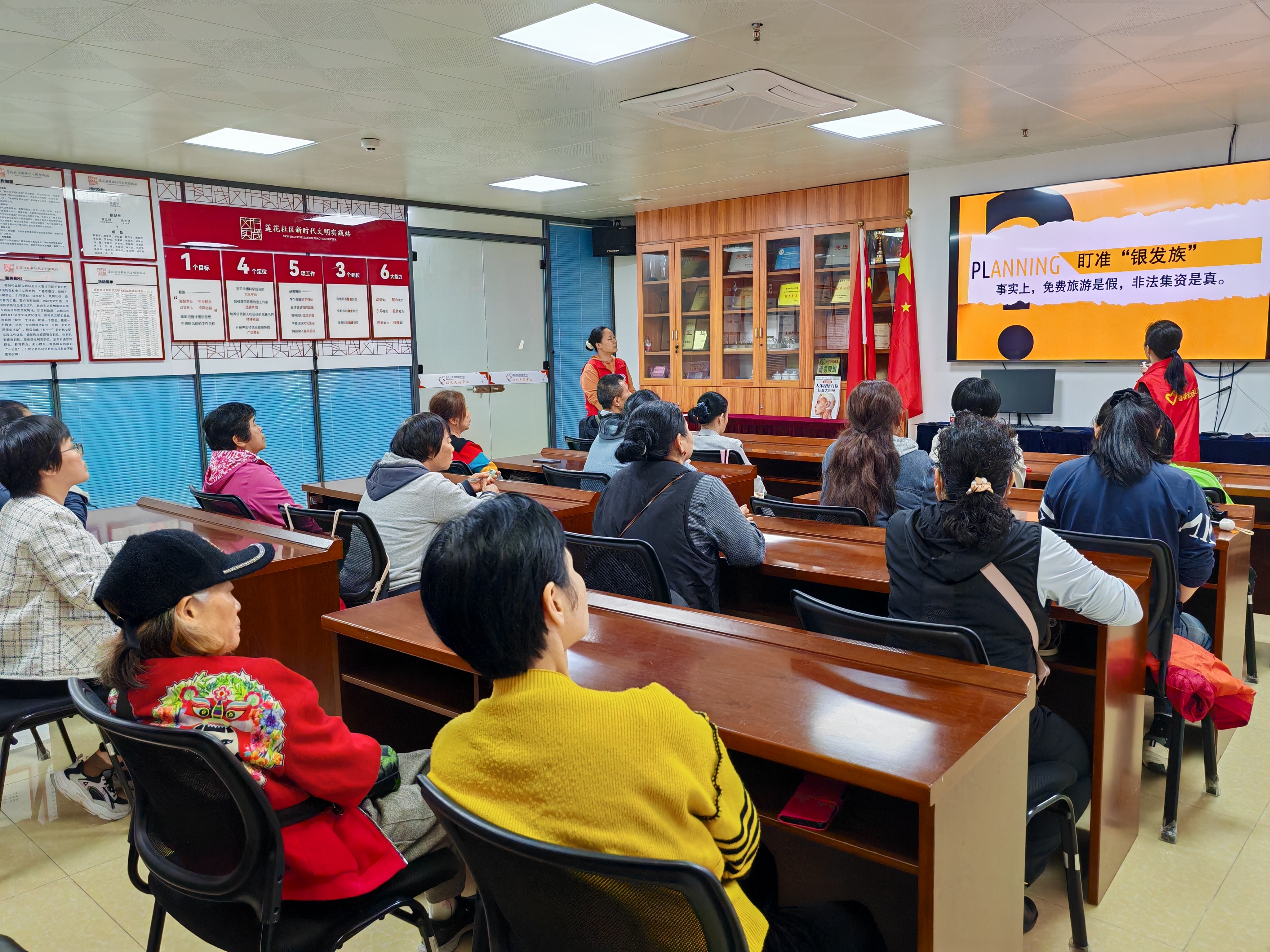 不仅如此,杨社工还重点揭示了不法分子精心设计的诈骗套路。她指出,这些不法分子常常披着合法的外衣,利用投资理财的高收益承诺、养老服务的贴心关怀、健康保健的虚假宣传以及免费旅游的诱惑等名义,巧妙地设置一个个看似美好实则危险的陷阱,处心积虑地引诱居民上当受骗,居民们务必提高警惕。