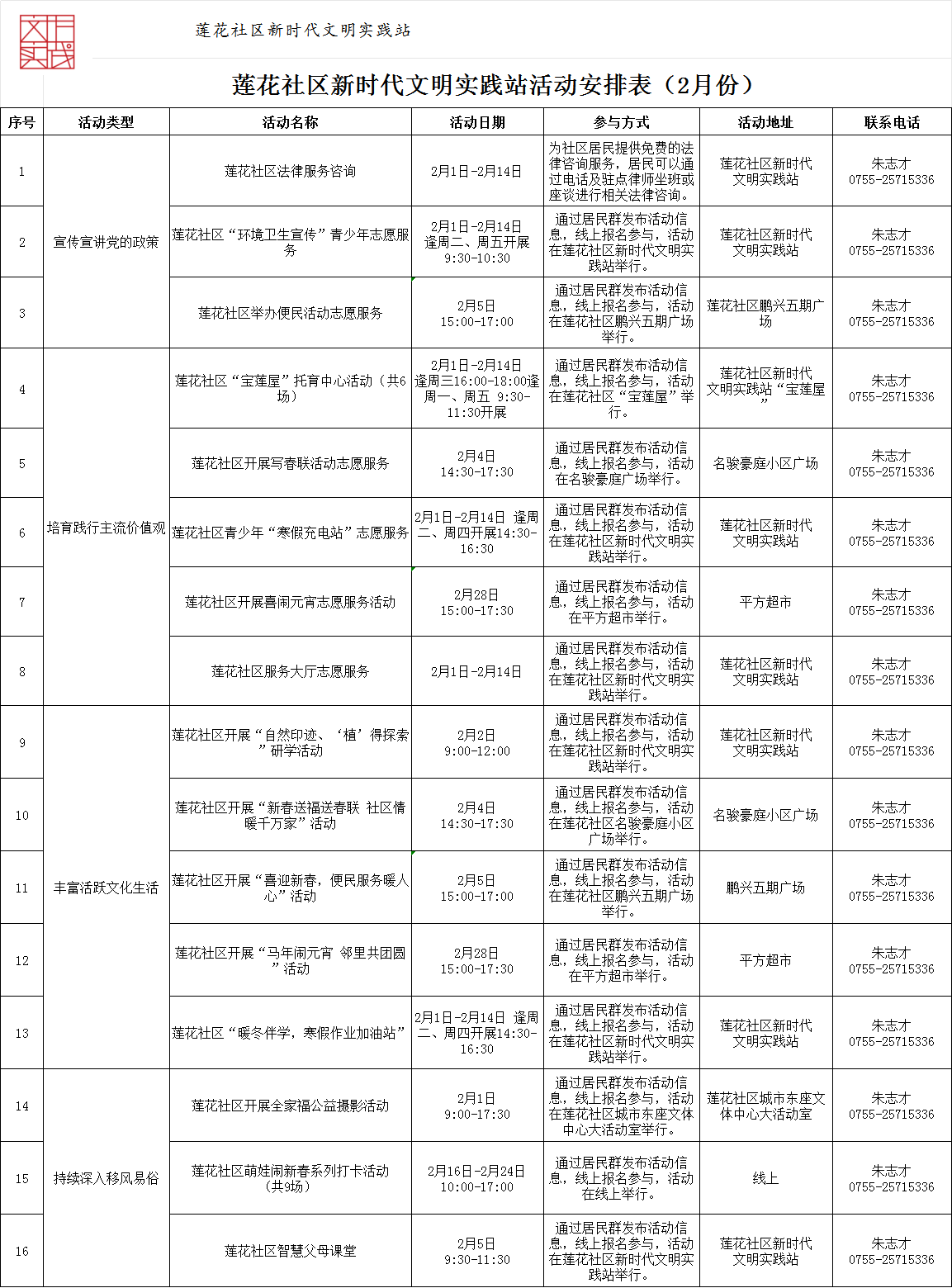 莲花社区新时代文明实践站活动安排表(2026年2月份)