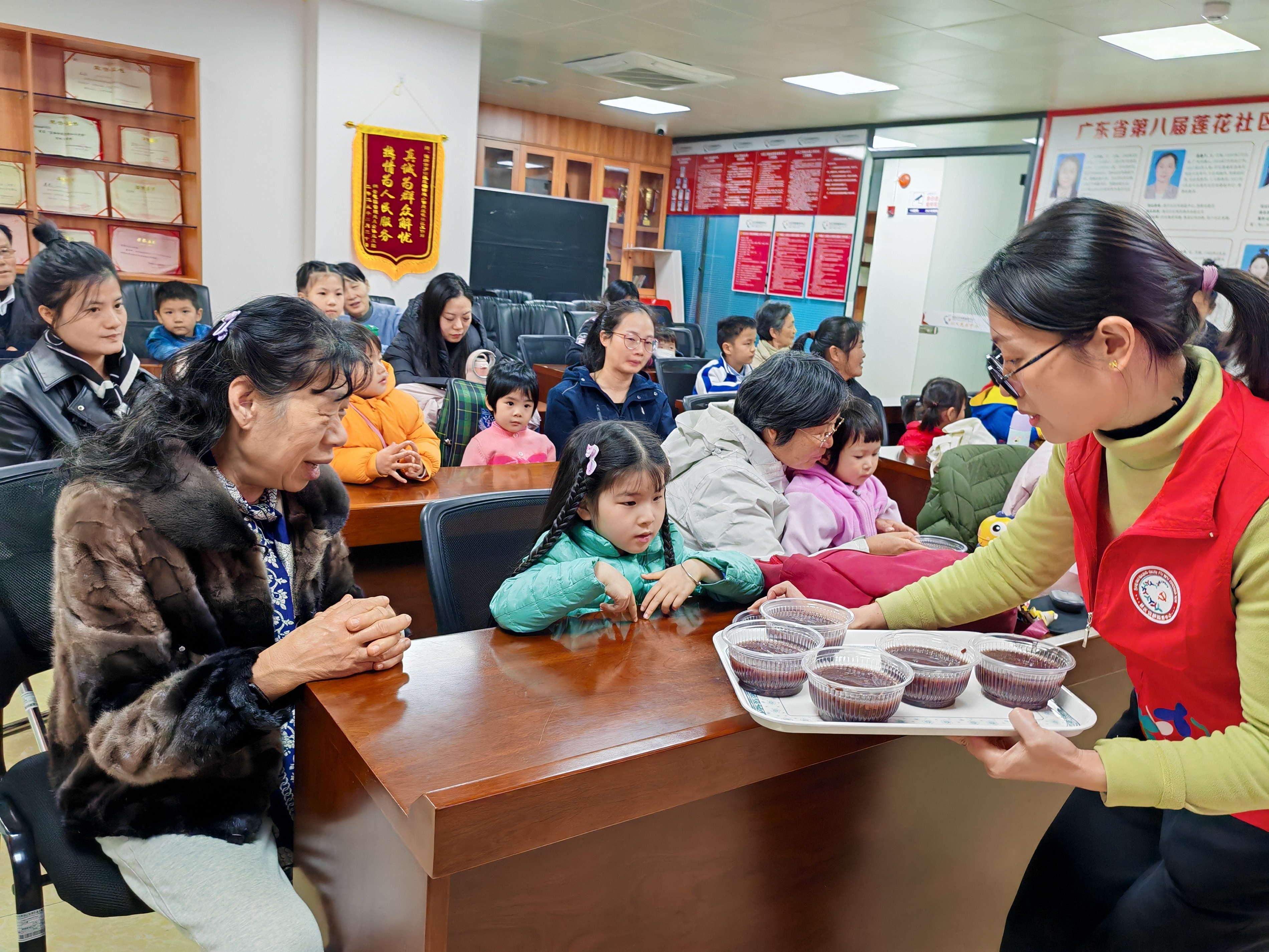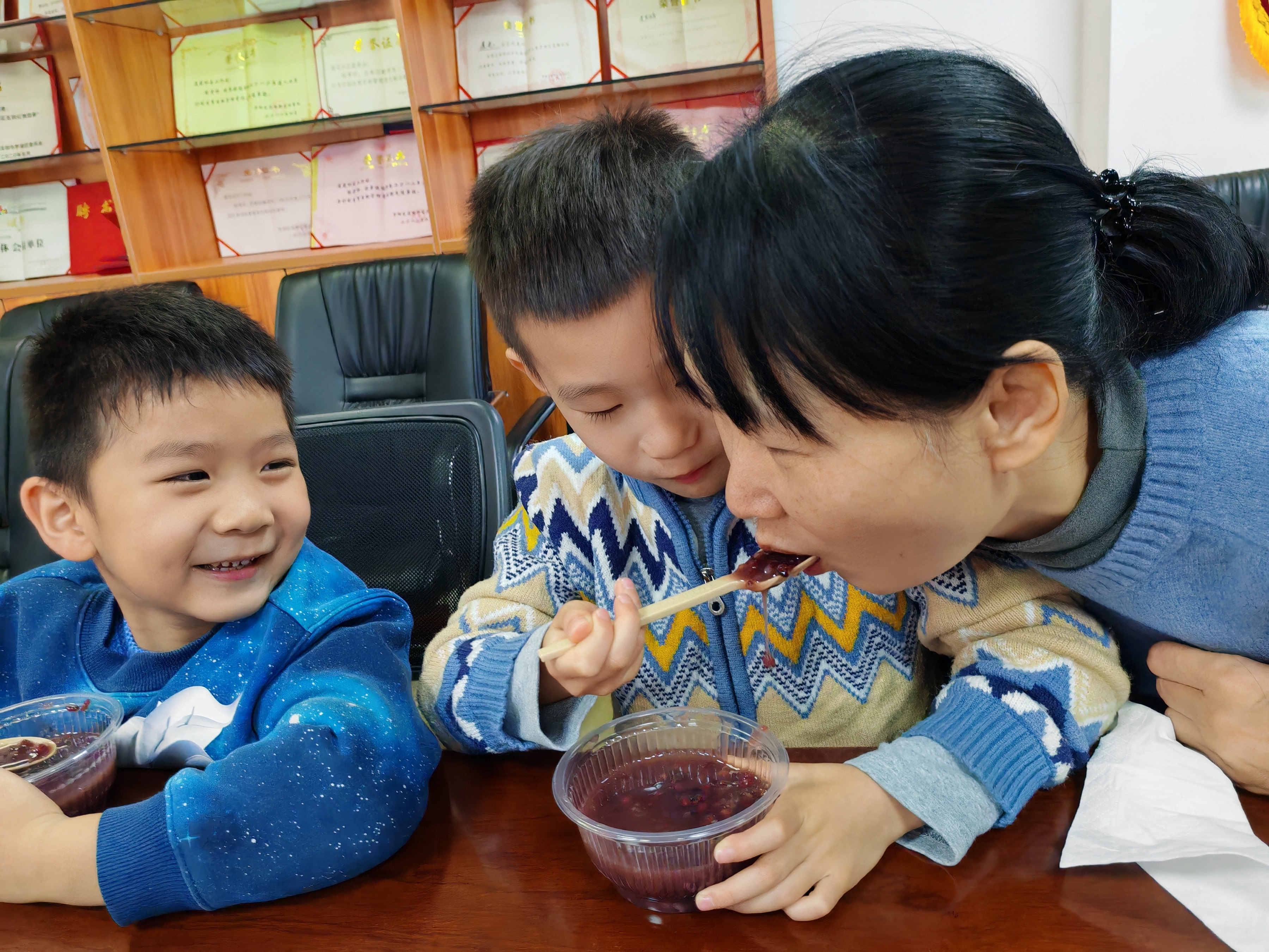 活动接近尾声时,社工将志愿者们提前熬煮好的腊八粥分发给在场的亲子家庭。孩子们主动将热气腾腾的腊八粥喂到家长们嘴边,用实际行动传递着这份冬日里的温暖。香甜软糯的粥品驱散了冬日的寒意,大家一边品尝着美味的腊八粥,一边分享着分豆豆环节的心得与乐趣。现场欢声笑语此起彼伏,处处洋溢着浓浓的节日氛围。