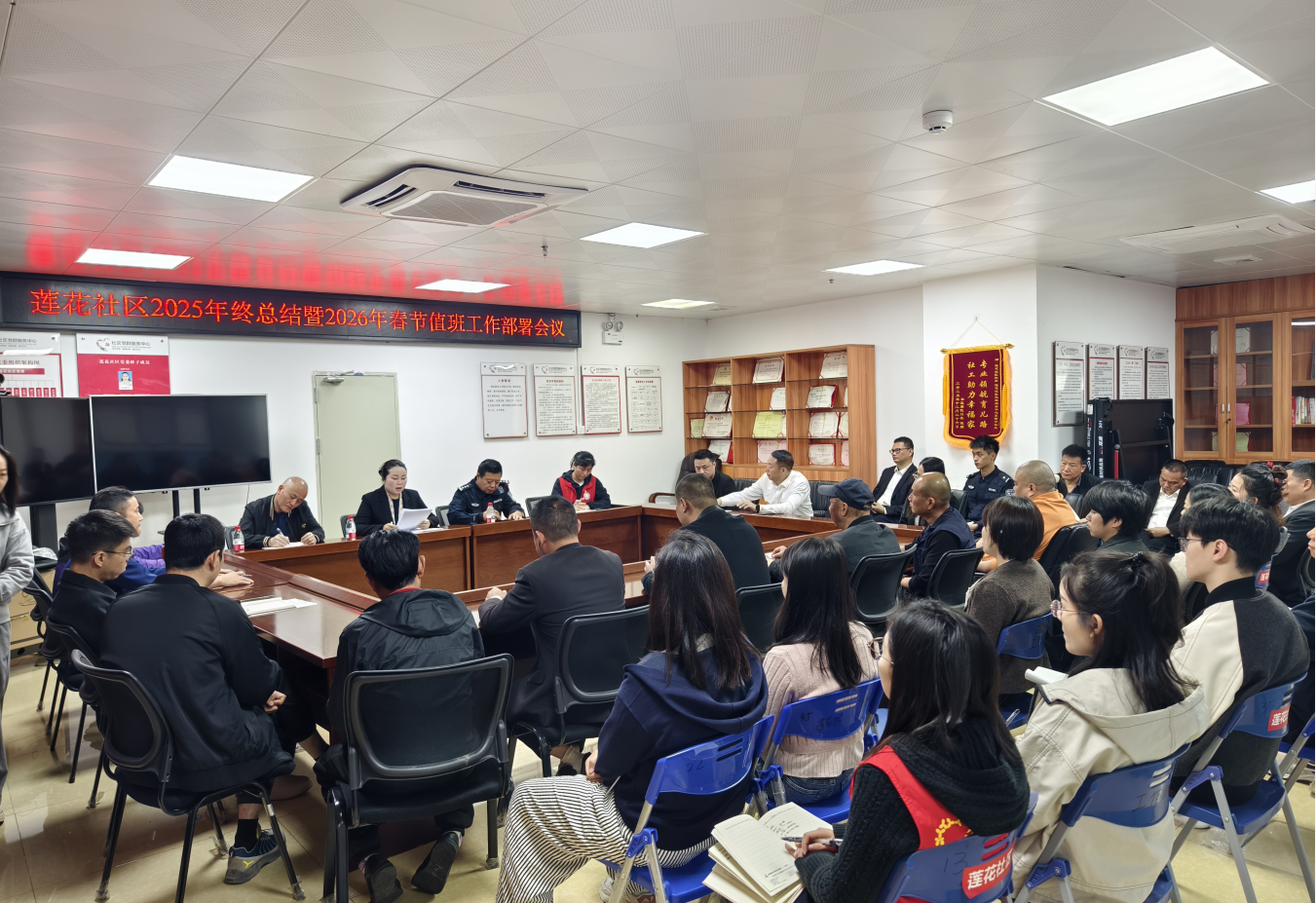 2026年2月5日上午,莲花社区组织召开2025年度工作总结大会暨春节值班工作部署会议。辖区各物业单位负责人、莲花社区小型消防站站长、辖区民警及社区工作人员齐聚一堂,共话社区发展,共商安全大计。