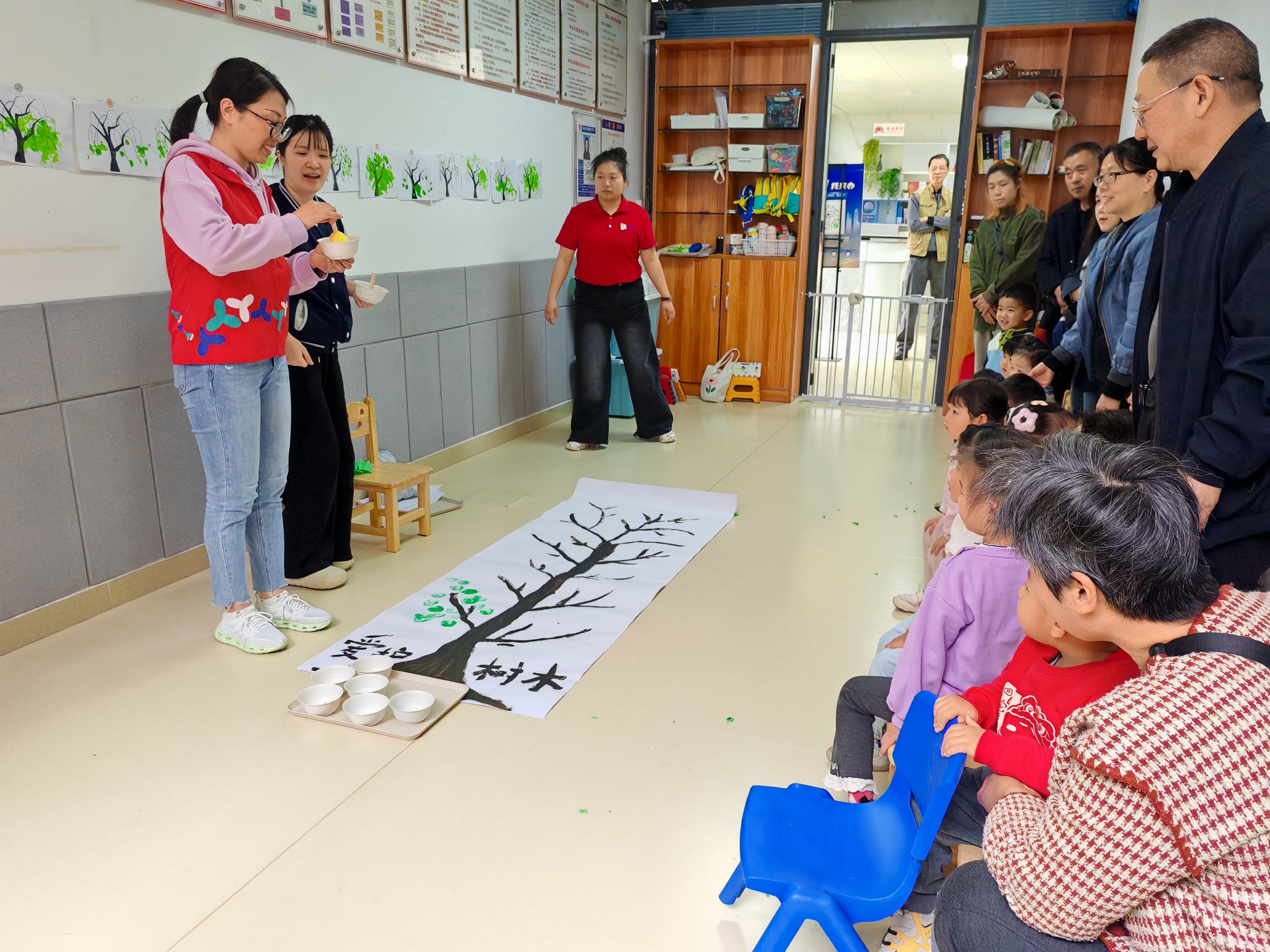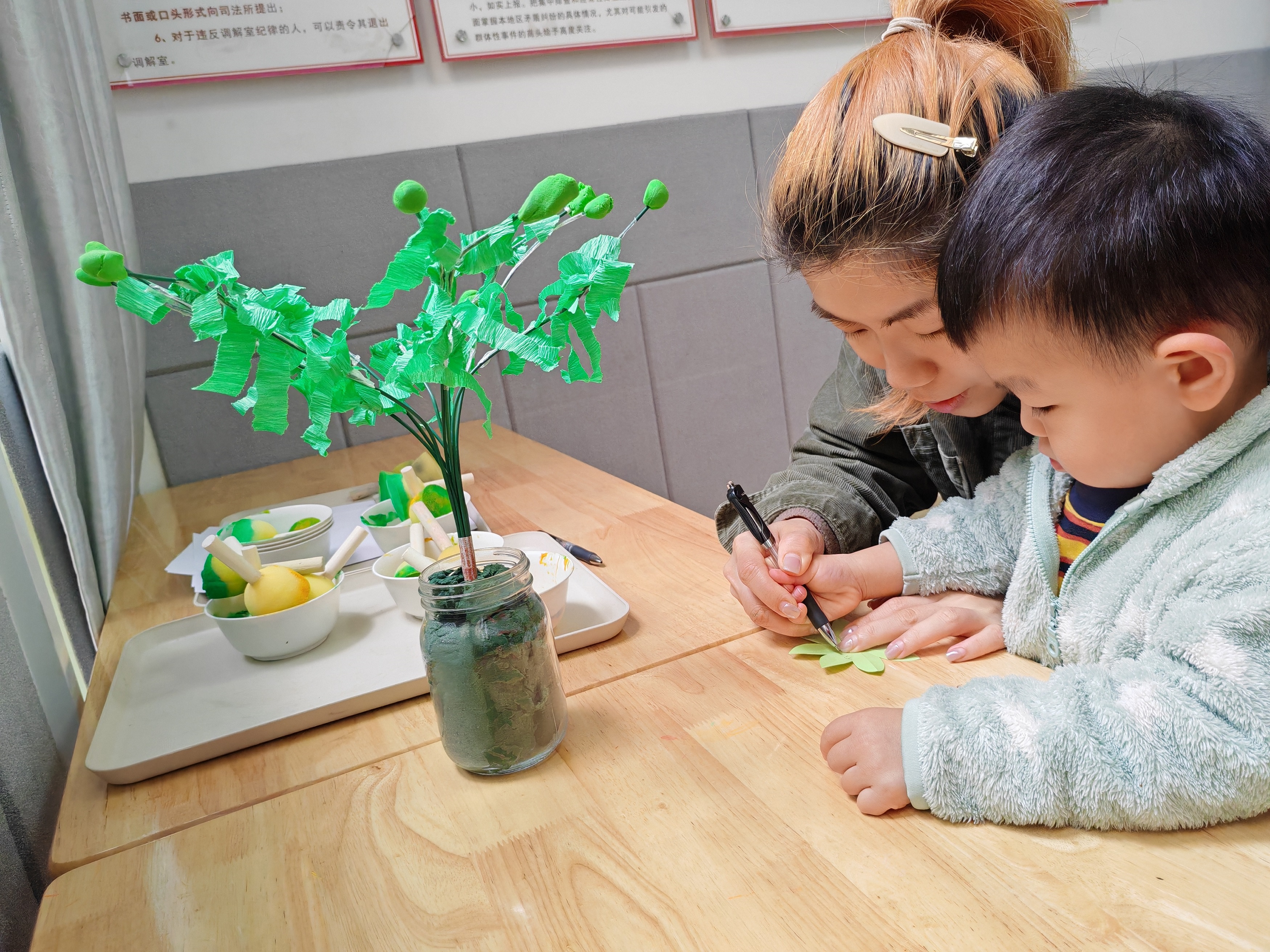 另一边,亲子家庭围坐在一起,发挥奇思妙想绘制纸质“树叶”。孩子们专注认真,绘制完成后,大家在“树叶”上写下名字和心愿,“小树和我一起成长”“愿地球妈妈更健康”……纯真祝福跃然纸上。接着,孩子们小心地将写满心愿的“树叶”粘贴到树冠上。不一会儿,光秃树干“长”出繁茂枝叶,仿佛在欢快诉说,每个家庭的积极参与正汇聚成社区蓬勃的绿色力量。