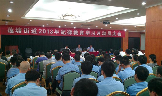 为加强机关职工纪律教育,莲塘街道按照罗湖区委要求。于2013年8月5日下午2:30在街道召开了2013年纪律教育学习月动员大会。参会人员有机关各科室人员,股份公司各社区工作站工作人员以及房屋租赁站工作人员约二百余人。会议由街道党工委副书记何庆生主持,由街道党工委副书记程建群宣传精神文件,街道党工委书记罗学怡为机关全体职工宣讲党课。