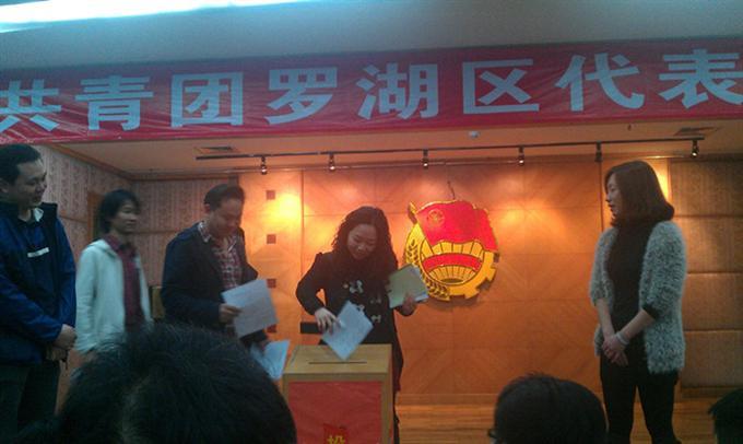 2014年3月12日下午2点30分在罗湖区青少年活动中心罗湖区共青团代表大会隆重召开,莲塘社区一名团代表前去参加投出神圣一票。代表大会共出席73名代表,派出选票73张,收回73张,选出罗湖区共青团代表将参加深圳市共青团代表大会。