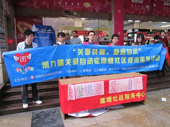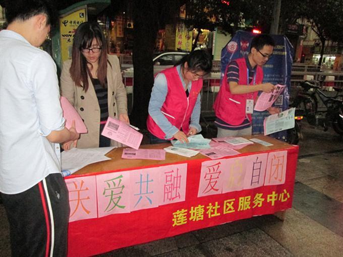 莲塘社区服务中心于2014年4月1日下午2点在莲塘岁宝货门前开展“关爱共融,爱启自闭”第九届关爱自闭症周暨社区宣传倡导活动。活动主办单位:深圳市自闭症研究会,支持单位:壹基金,大福基金,承办单位:深圳市新现代社工服务中心莲塘社区服务中心。活动现场向社区居民派发相关的宣传资料共400余份,通过活动宣传莲塘社区服务中心真诚想为社区自闭症人士开启关爱共融之门,让她们不在生活于自己的世界里,解放她们让她们能够融入社会当中来。