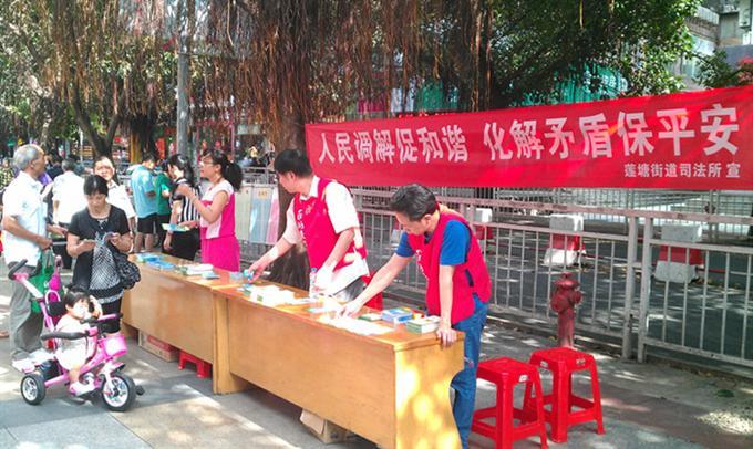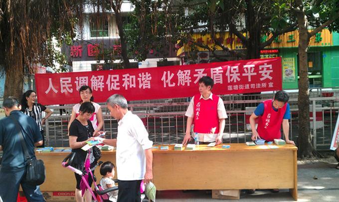 为进一步加强社区人民调解促和谐,化解矛盾保平安的普法意识。2014年2月21日下午在莲塘岁宝百货门前举办了一场关于人民调解的宣传活动。活动现场向社区居民群众派发相关宣传资料200余份,其次活动还开展有奖知识问答,社区居民群众通过悬挂的知识问答题进行答题,通过答题很大程序上提高了居民群众的调解知识。