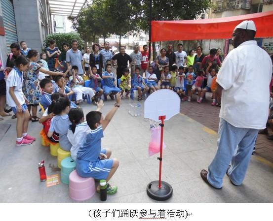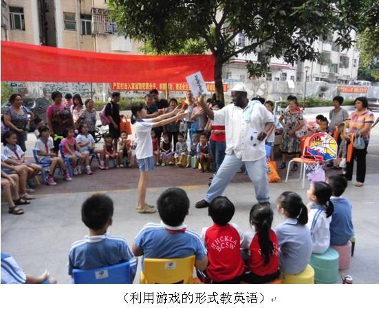 很荣幸邀请了外国教习Derek担任本次英语角活动的主持人,别看他黝黑、魁梧的身材,幽默的天分使他受到了孩子们的欢迎,同时过往的大人们都纷纷止住脚步,被他诙谐的动作和语言给吸引了,他巧妙的把英语和运动结合在一起,给予孩子们运动的乐趣,也潜移默化地教会孩子们一些简单的英语单词,场内不时地传出欢声笑语,孩子们踊跃地接受“挑战”,享受着游戏的乐趣,也在不知不觉下学习着英语。