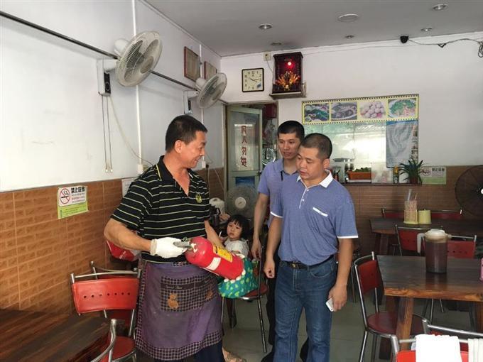 为提升辖区门店的消防安全意识,提高抗击突发事件的应变能力,掌握正确使用灭火器的方法,2016年6月15日莲塘社区安全专干和莲塘街道有关工作人员一起在辖区内开展灭火器使用宣传培训活动。活动中,工作人员向门店宣传预防火灾的重要性,详细地向员工传授常用消防设施和灭火器的使用:拿到灭火器后除掉铅封,拔掉保险销,上下颠倒几次,使筒内干粉松动,左手握着喷管,右手提着压把,在距火焰二米的地方,右手用力压下压把,左手拿着喷管卡左右摆动,使喷射干粉覆盖整个燃烧区,没有喷管的,直接将喷口对火焰后压下压把,左右摆动,也要使喷射干粉覆盖整个燃烧区。