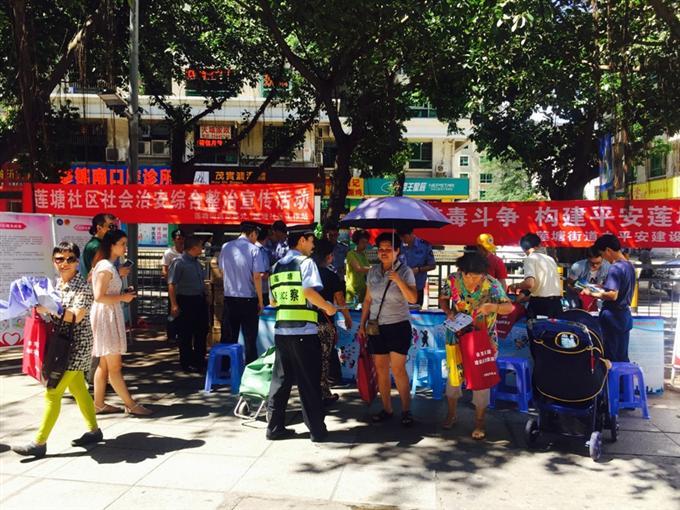 为了提高群众的治安防范和自我保护意识,2016年6月24日上午10点莲塘社区组织工作人员在莲塘岁宝百货广场前开展社会治安综合整治宣传活动,受到了居民群众的一致好评。
