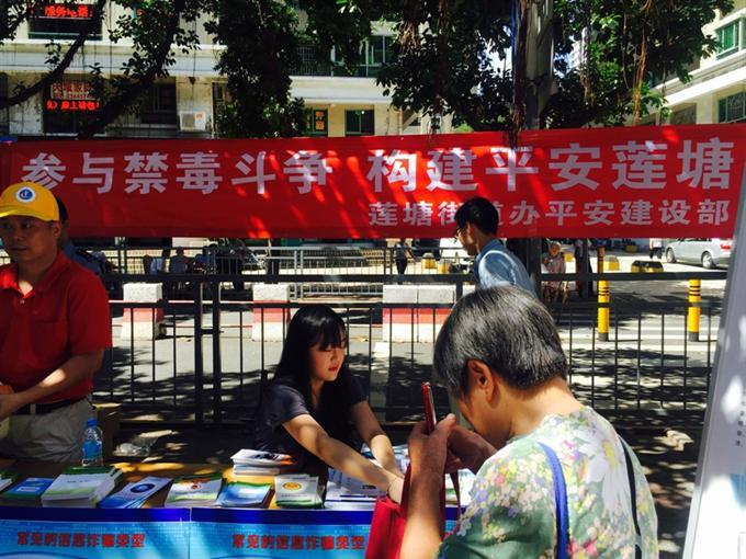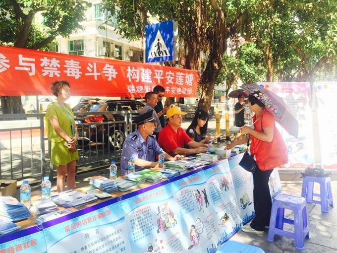 为提高辖区居民群众识毒、防毒、拒毒的意识和能力,进一步加强禁毒宣传教育力度,2016年6月24日上午莲塘街道与莲塘社区在岁宝百货广场前一同组织开展了以“参与禁毒斗争,构建平安莲塘”为主题的禁毒宣传教育活动。活动中工作人员及志愿者向过往居民分发禁毒环保袋和禁毒宣传资料,告诫广大居民群众毒品的危害性。另外,竖立在活动现场的展板则用生动形象的图文向居民介绍了常见毒品种类及其危害,让居民了解如何识别毒品、拒绝毒品,提高在防毒拒毒方面的能力。此次宣传活动有利于在社区中营造出禁毒宣传气氛,增强居民群众对毒品的抵制能力,让禁毒防毒从社区做起,从自我做起。