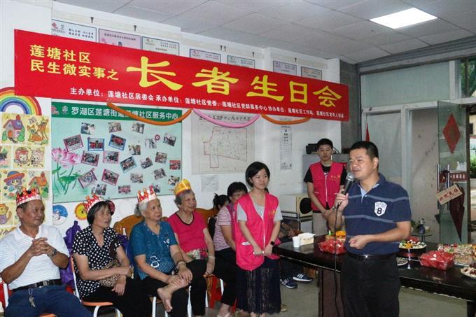 2016年7月5日下午,莲塘社区驻点团队来到莲塘社区党群服务中心一同参与了社区本季度的幸福老人集体生日会活动。驻点团队成员为老人们送上真挚的祝福,并陪同老人们一起庆祝度过一个有意义的生日,在场的寿星们都非常高兴。活动最后由所有的寿星公一起许愿吹蜡烛,大家一起唱生日歌、品尝蛋糕,活动在一片欢笑声中拉下帷幕。