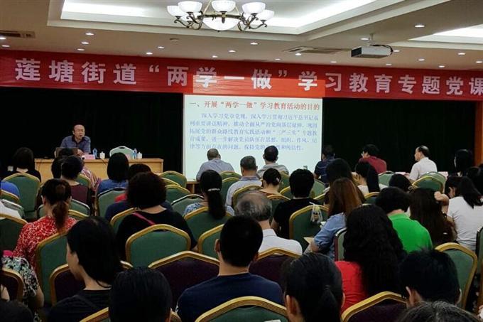 为全面推进“两学一做”学习教育,深入学习党章党规,深入学习贯彻习近平总书记系列重要讲话精神,2016年7月8日上午莲塘社区组织辖区在职党员参加莲塘街道组织开展的“两学一做”学习教育专题党课活动。讲座就“两学一做”学习教育的内涵和要求作了深刻阐述,要求全体党员进一步领会“两学一做”学习教育的精神实质和内涵,要认真学习党章、自觉遵守党章、切实贯彻党章、坚决维护党章,切实做好自己的本职工作,做一名合格党员。引导广大党员以“两学一做”学习教育为契机,不断提高自身思想素质,增强宗旨意识和群众观念,将“两学一做”学习教育落到实处。