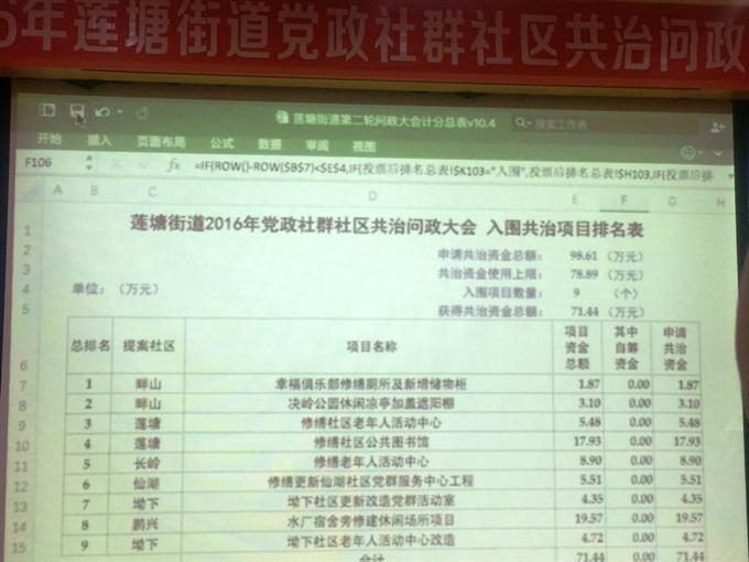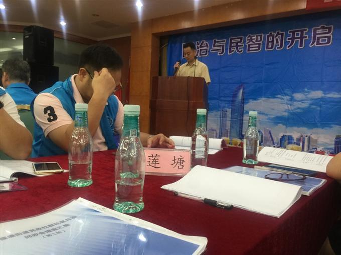 2016年8月31日上午,莲塘社区参加了2016年莲塘街道党政社群社区共治问政会,主要参会人员为街道和八个社区的居民议事会议事代表,每个社区陈述提案时间分别为5分钟,然后交由街道各社区议事代表对项目进行评分,莲塘街道8个社区共决出12个提案参加此次街道党政社群问政会PK。