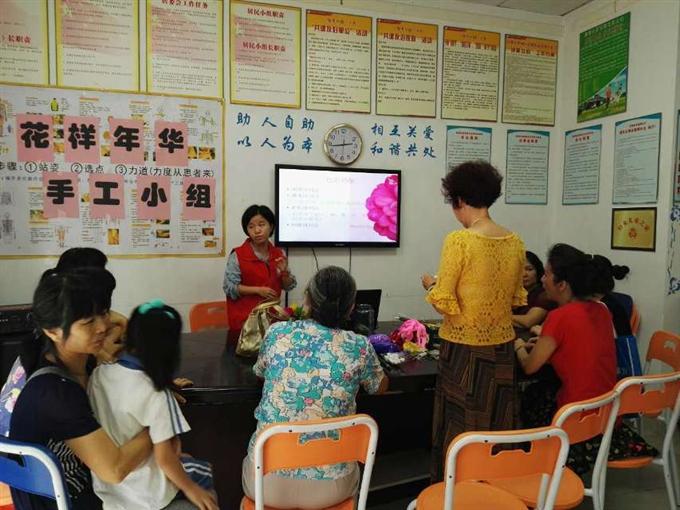 活动开始后由社区工作人员详细讲解丝网花的制作过程及制作过程注意的要点。由她们先行示范如何制作之后,再发放工具让参与的社区居民一起动手制作,参与该项活动主要是社区家庭主妇或由外地随子女过来带孩子的中老年人,她们平常生活基本只围着家庭跟孩子转,生活圏子比较窄,带动她们参与到社区活动中,能够开阔她们的心灵、拓展她们的交际,提高她们对社会的参与感,增加更加多的正能量,让家庭生活更和谐。