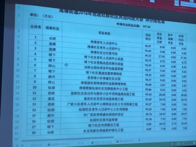 莲塘社区在2016年的党政社群社区共治中总共通过了2个项目,都分别于2017年1月至2月完工并投入使用。《修缮社区老年人活动中心》和《修缮社区公共图书馆》两个项目均得到辖区居民群众的好评,给社区居民一个安全舒适、宽敞明亮的活动环境。在问效会中,两个项目分别获得了95.69分(修缮社区老年人活动中心)和95.15分(修缮社区公共图书馆)。(莲塘社区发言人 陈颖琳)