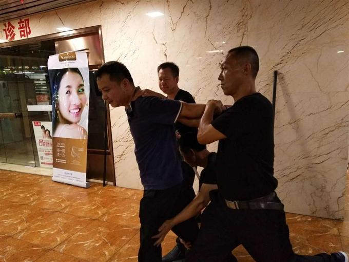 经过近数分钟的搏斗,管理处员工成功将一名“歹徒”制服,管理处主任则与另一名“歹徒”进行周旋,避免其进入小区造成伤害。待110特警队员赶到后,将该歹徒制服,随后两名“歹徒”被带离小区。