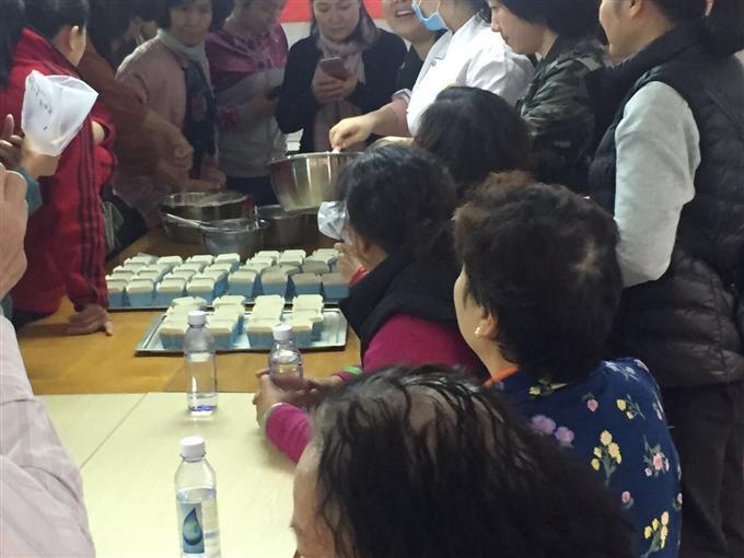 喜欢烘焙的社区居民收到消息之后都很准时来参加课程。大家很开心的围着老师,拿着手机全程录下教程,认真地听老师讲解做纸杯蛋糕的诀窍——打好的粉浆需要加一点玉米油,这样子做出来的蛋糕才会更加细滑,口感会更好。然后将调好的粉浆放在纸杯,180度15分钟就可以烤出美味的纸杯蛋糕。而且老师还教大家可以加入水果干或果仁变化不同口味的小蛋糕。
