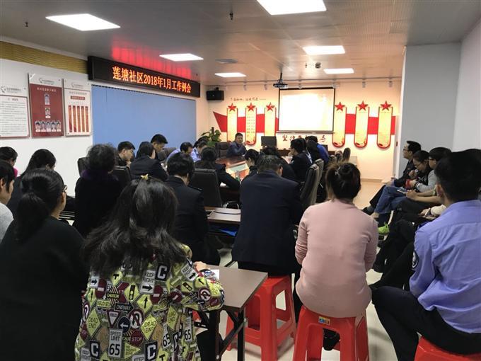 2018年1月3日下午莲塘社区工作站在会议室召开了每月工作例会。会议中有莲塘社区站长王建平、莲塘社区第一支部书记邓进强、莲塘社区工作站陶三山及所有的工作人员参加。会议具体有如下几点:一、传达了街道下发的工作事项安排,在12月中街道对我们社区网格检查的不理想,对检查较差的人员给予批评指正;同时对片区检查较理想的人员给予表扬,强调要保持;二、随时做好消防安全巡查工作,发现消防隐患要及时上报;三、党建工作要准备台帐资料以备检查;四、公布了2017年民生微事实的13项服务内容;五、强调在日常录入综合服务受理平台时必须谨慎;六、城管卫生等问题。(莲塘社区发言人:张丽梅)