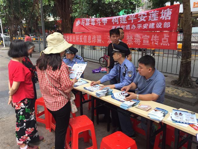 为进一步防范电信诈骗、打击毒品犯罪,有效提高广大群众防范电信诈骗和禁毒意识。2018年4月23日下午,莲塘社区联合辖区派出所,在岁宝百货广场,开展反信息诈骗、禁毒宣传活动。活动还得到了莲塘街道平安建设部的支持。