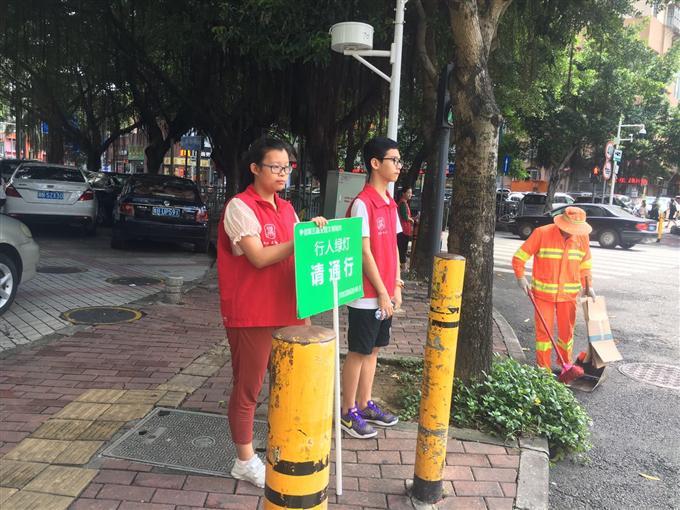社区青少年利用暑假期间,不论酷暑或雨天,身着志愿者服装,手举指示引导标识牌,带着青春的气息来到交通繁忙路口“上岗”。刚开始一切良好,途中难免有人因各种缘由闯红灯,经过我们青少年志愿者的劝阻,他们停止了前进的步伐,交通又恢复以往的繁华有序。