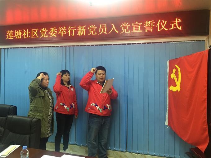 宣誓仪式在社区党委书记王建平领读入党誓词下,2名预备党员右手握拳举过肩头,面向鲜红的党旗,逐句庄严宣誓。宣誓仪式后,社区党委书记为预备党员逐一佩戴了党徽,增强了新党员的自豪感、荣誉感、责任感和使命感。(莲塘社区发言人:李杏鸿)
