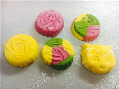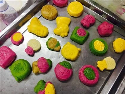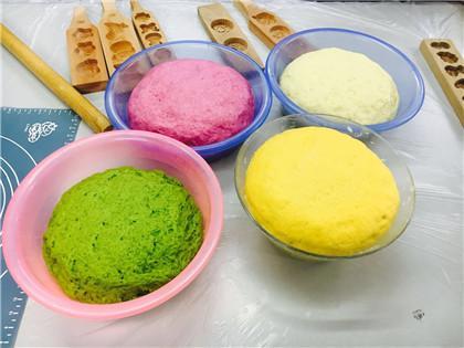 活动开始,巧手的阿姨们把菠菜、火龙果、胡萝卜打成汁调入面团,做成一个个漂亮得不像话的大面团,还用红糖水把白色面团揉成巧克力颜色。