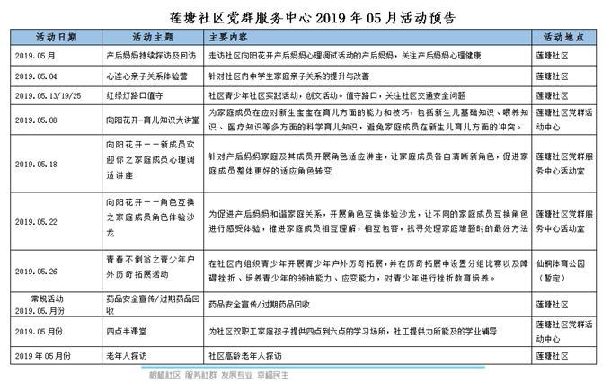 莲塘社区党群服务中心2019年05月活动预告