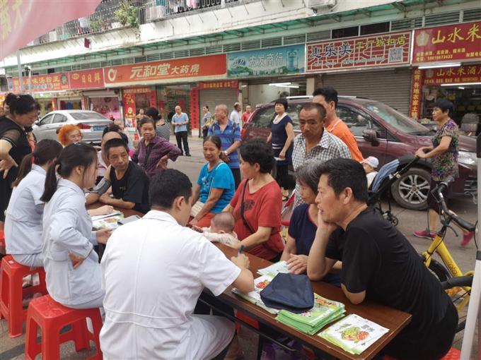 2019年5月17日上午,莲塘社区联合莲塘街道社区健康服务中心,在莲塘村休闲文化广场联合开展家庭医生签约服务咨询活动,现场医务人员为前来体验的居民群众开展测量血压和血糖等义诊服务。