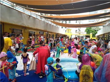 活动一开始,孩子们和家长都整装待发,等到律动音乐响起来,立马开心不已,兴奋的拉着爸爸妈妈跑进去找到位置坐好。小眼睛盯着主持人一眨不眨,对接下来的欢乐游戏充满期待。宝爸宝妈似乎也被孩子们的热情感染了,童心大发,跟着孩子们积极参加挑战。“欢乐时装秀”宝爸宝妈纷纷登场,凹出了各种造型;“快乐雪糕筒”游戏把今天的活动逐步推向高潮,孩子们的童真笑容彻底的感染了宝妈宝爸,最后大家一起利用各种道具嬉水,彻底释放自我,一起嗨翻天!