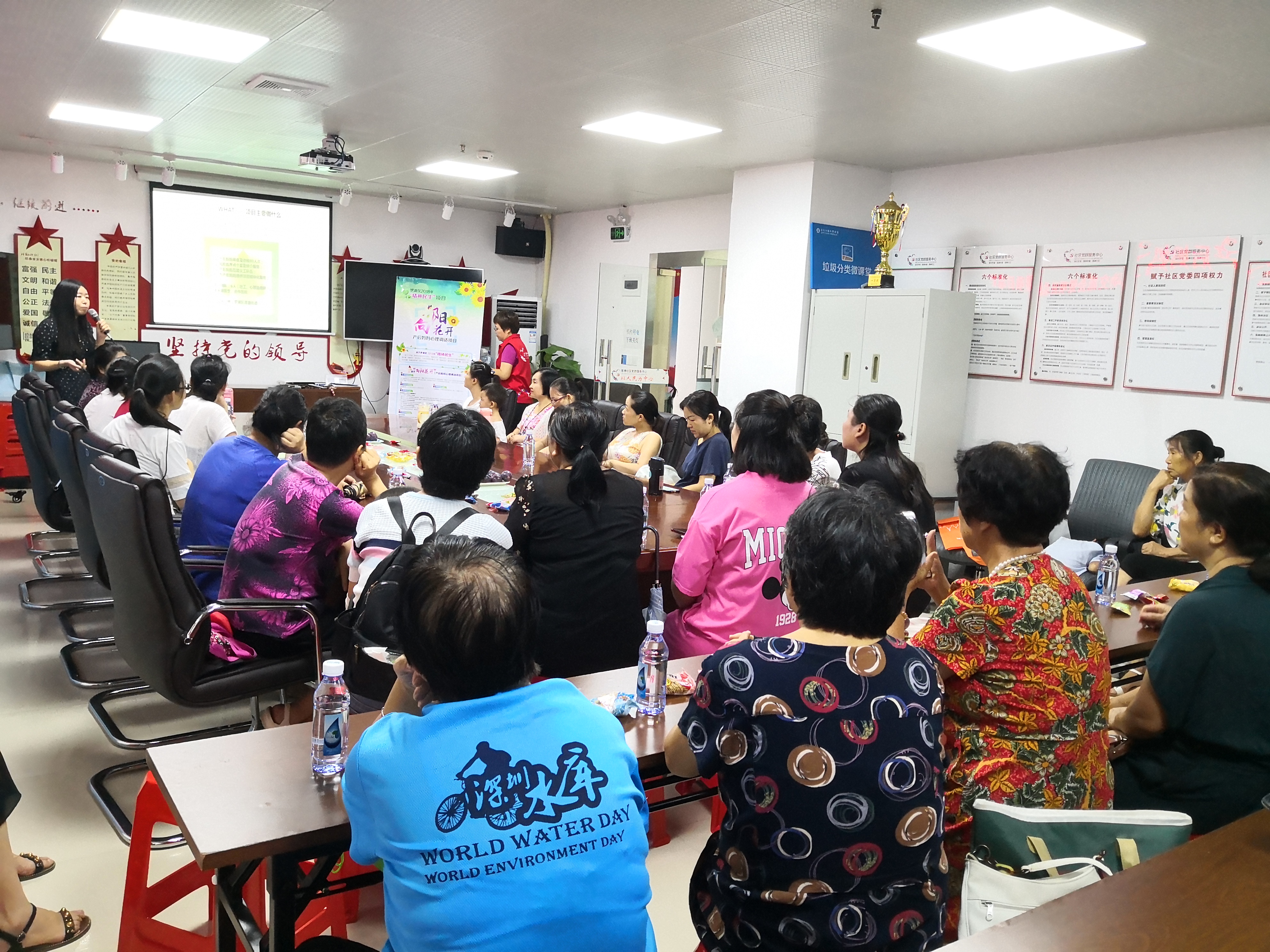 下午两点半,活动一开始,主持人戈女士先向大家展示回顾“向阳花开”项目一年来的活动内容及成效,其中包括上门探访产后妈妈87人次,开展了13场活动,从角色转变沙龙,到心理解压,家庭成员角色体验营,情绪管理,以及育儿知识大讲堂等,共直接受益513人次,间接1000人次以上,同时要感谢一年来,三个社区的义工,他们在探访活动过程中的付出。