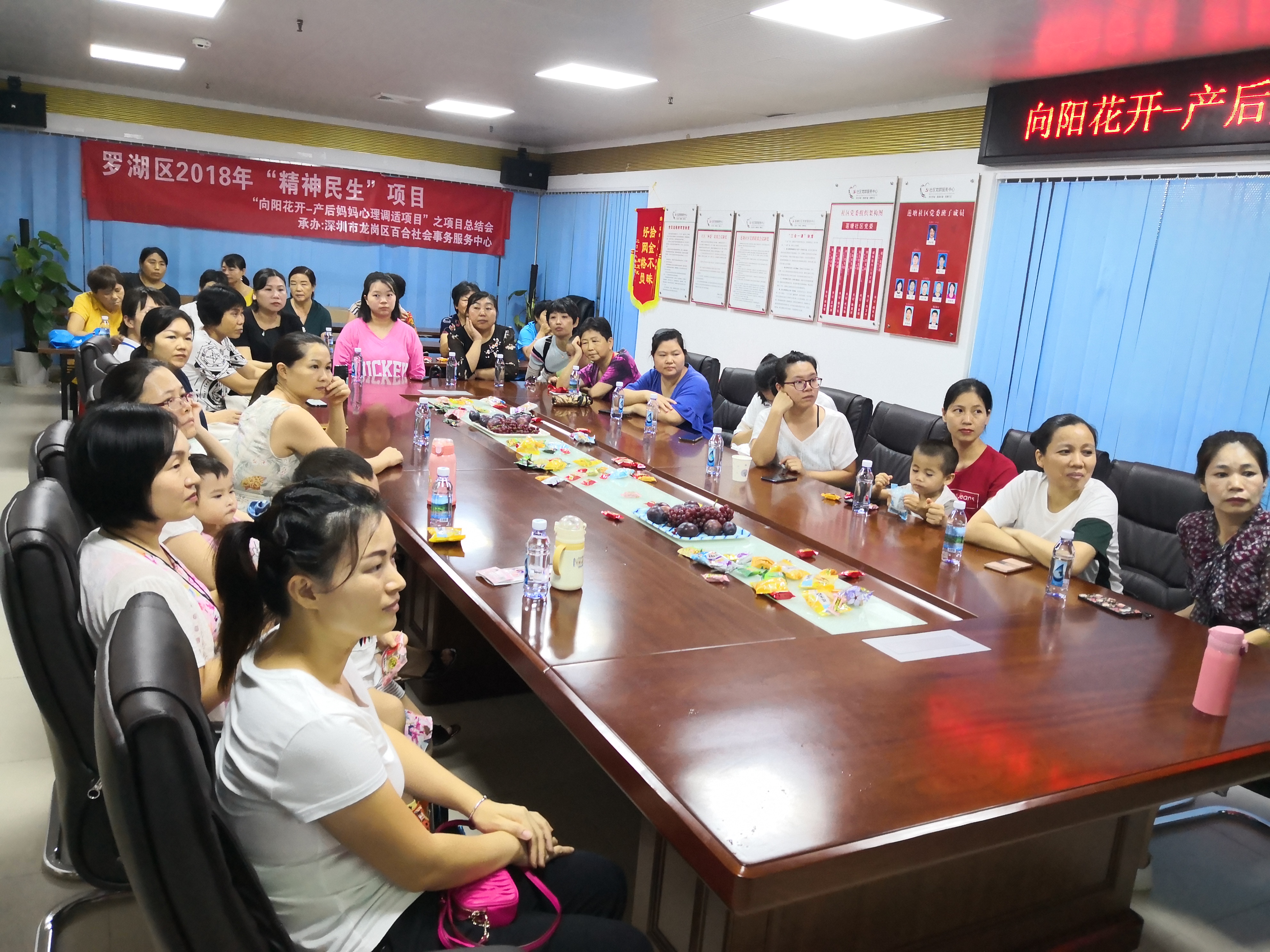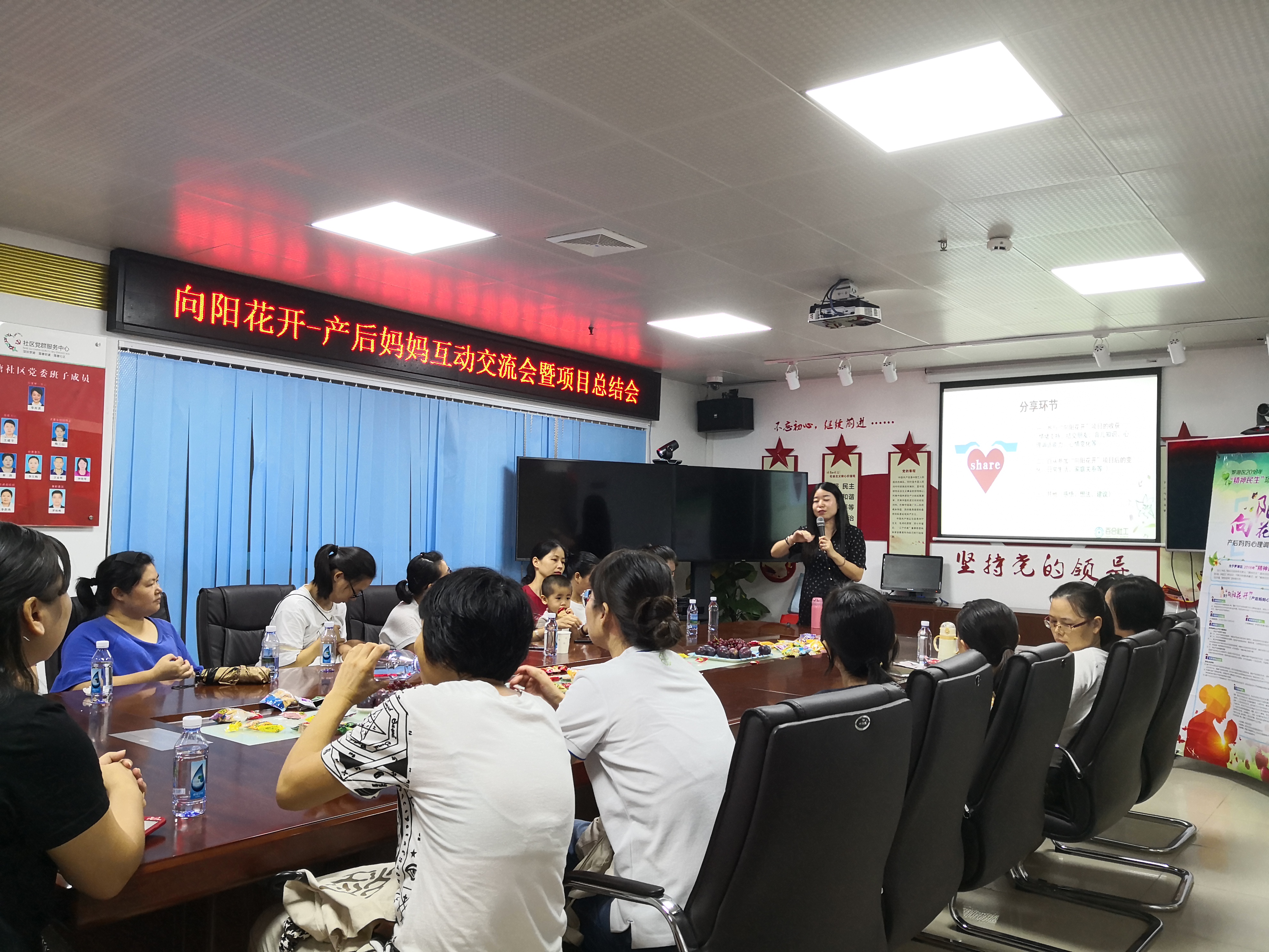 罗湖区“精神民生”向阳花开-产后妈妈心理调适项目历时一年时间,终于迎来了尾声, 2019年8月27日,“产后妈妈互动交流会暨项目总结会”在莲塘社区党群服务中心如期开展,吸引了莲塘、仙湖、畔山3个社区的28位产后妈妈积极参与。