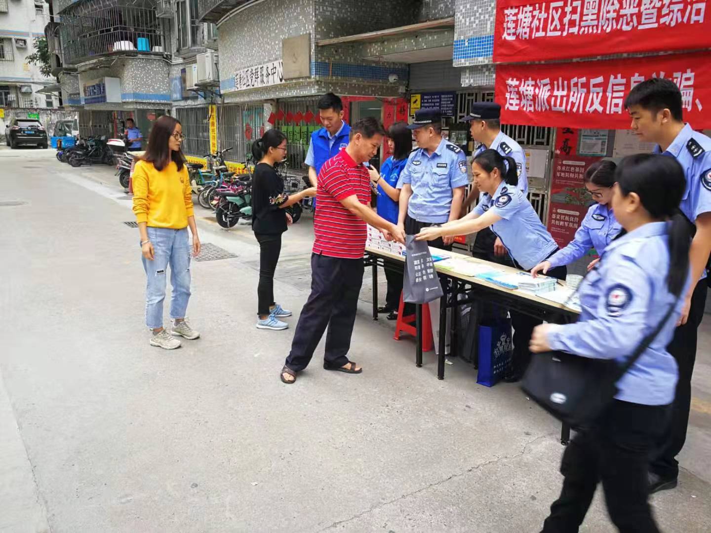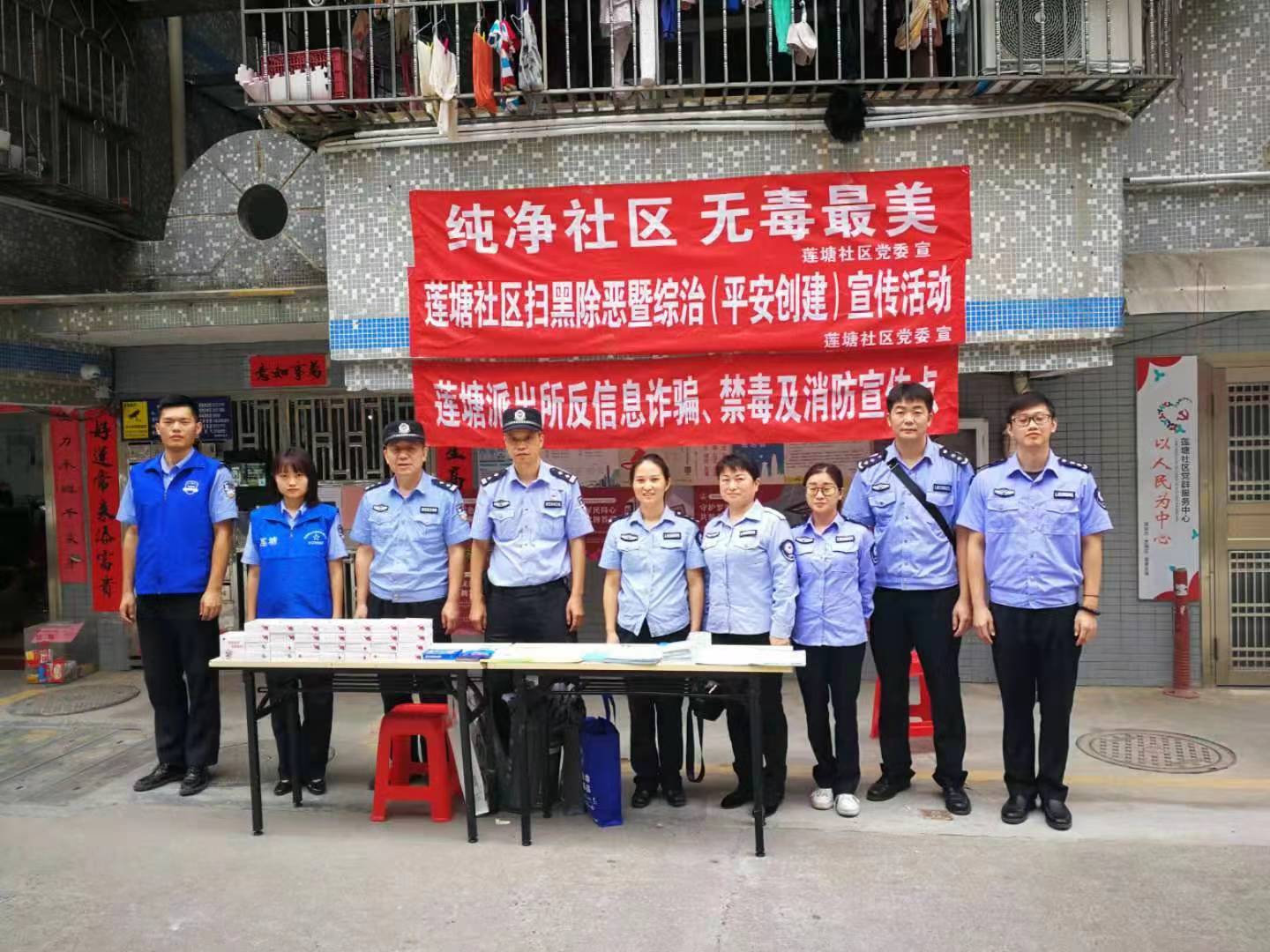 莲塘社区讯:近日,莲塘社区工作站网格员联同派出所领导、社区警务室全体成员在莲塘村莲塘花园小区内开展了“拒绝毒品,扫黑除恶,反邪教”共建共享平安莲塘宣传教育活动。