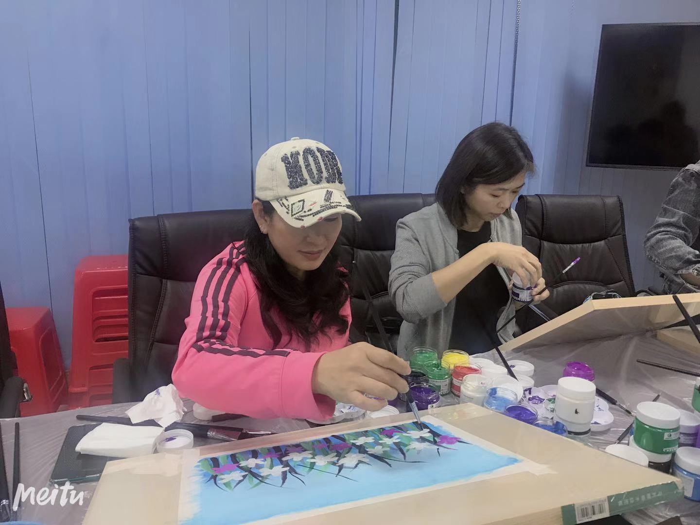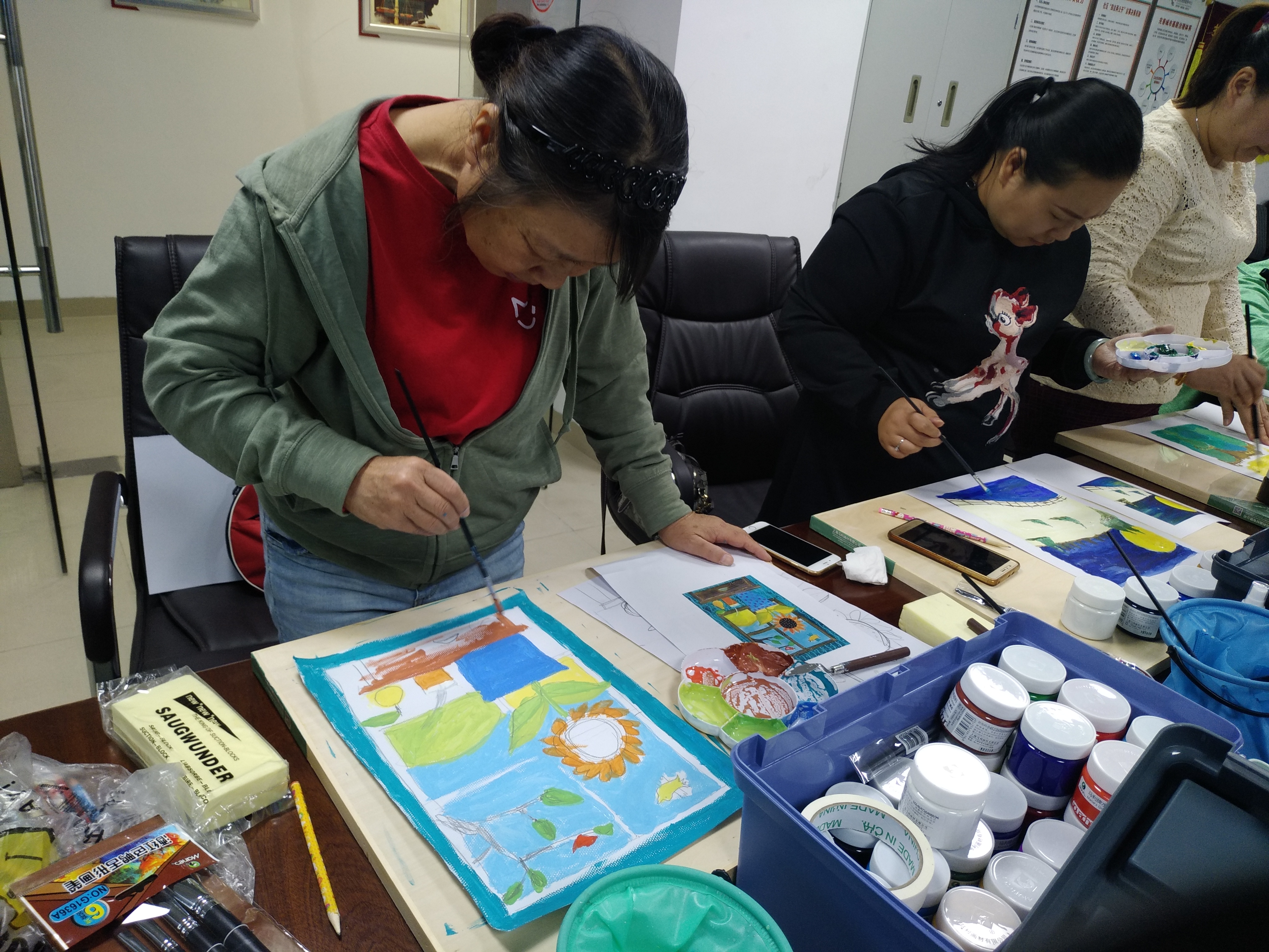 活动现场,培训老师首先通过PPT向大家展示了水粉画的特性,填色过程中的技巧及注意事项,居民们初步熟悉和认识了色彩变化的规律,色彩形成的法则原理,色彩的冷暖关系等,重叠等方法作画的技能。随后在老师的指导下,居民们开始了水粉画的创作,画出了一朵朵娇艳欲滴的花儿,描绘出对美好生活的热爱。