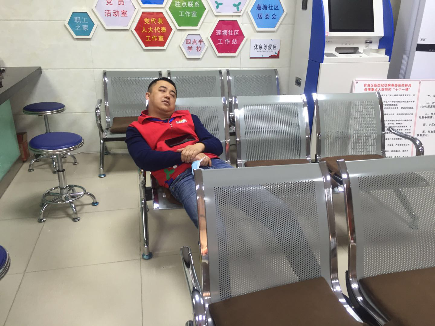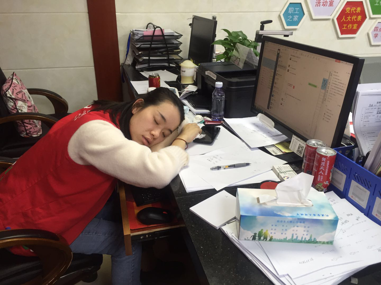 社区防疫人员工作压力大,身心疲惫,大多初二就返岗工作,已经连轴转了近一个月,每天都要值守体温监测点、劝说群众、上报各种报表等。社区党委副书记忙完后勤保障工作、给各个体温监测点补充好物资回到办公室,疲惫地坐在椅子上,还未跟同事们说几句话就睡着了。负责报表的同事,在做好相关报表后,马上趴桌子上就睡着了。