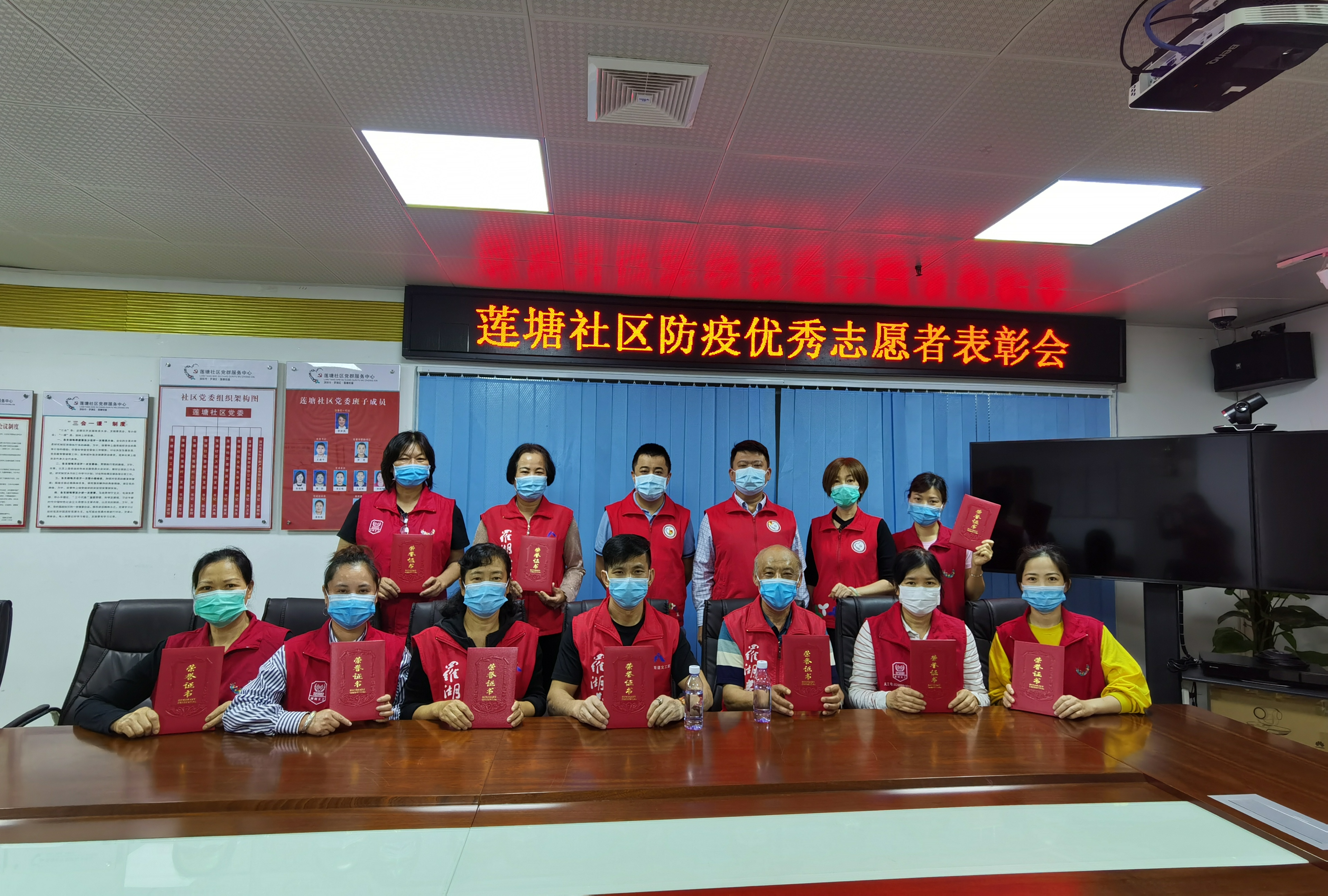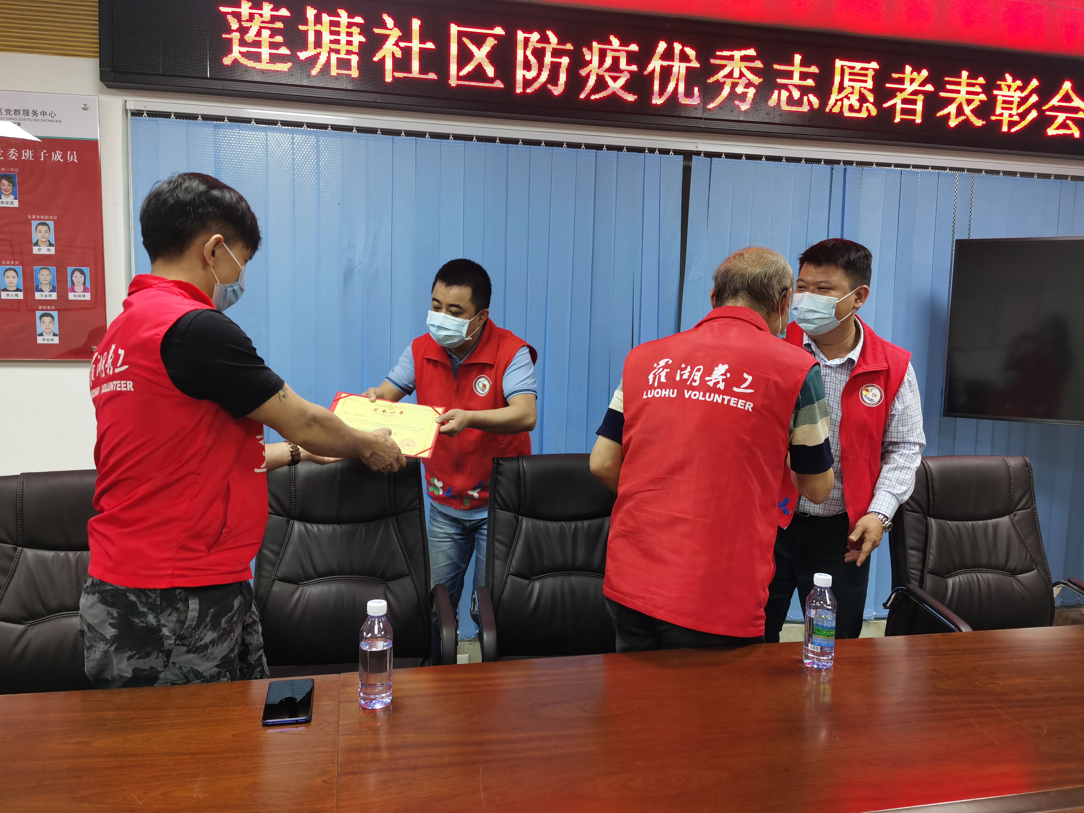 表彰会上,莲塘社区党委书记王建平、副书记罗奇为第一批优秀志愿者颁发了荣誉证书,王书记说:“感谢各位志愿者在疫情期间对我们工作的大力支持,挺身而出逆行在抗疫第一线,服务广大社区民众。”志愿者们说,在困难时期我们每个人付出一点,大家理解支持一点,共同面对特殊时期,是我们每一个居民都应该做的。