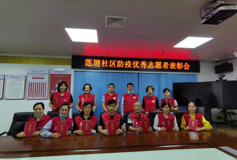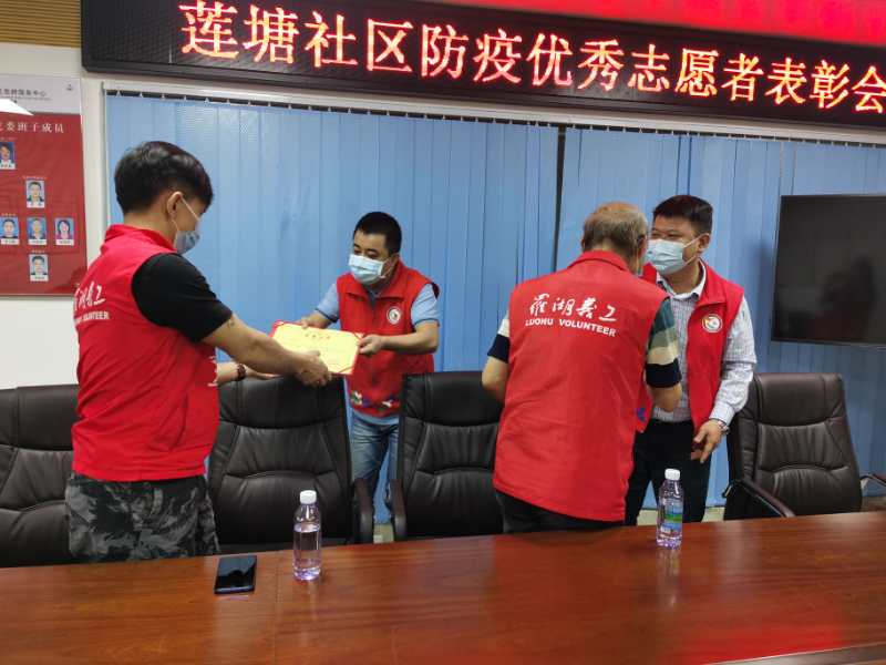 表彰会上,莲塘社区党委书记王建平、副书记罗奇为第一批优秀志愿者颁发了荣誉证书,王书记说:“感谢各位志愿者在疫情期间对我们工作的大力支持,挺身而出逆行在抗疫第一线,服务广大社区民众。”志愿者们说,在困难时期我们每个人付出一点,大家理解支持一点,共同面对特殊时期,是我们每一个居民都应该做的。我们相信,在社区党委的领导下,广大党员干部冲锋在前,广大居民志愿者众志成城,就一定能把社区这道防线坚决守住,胜利必将属于我们!