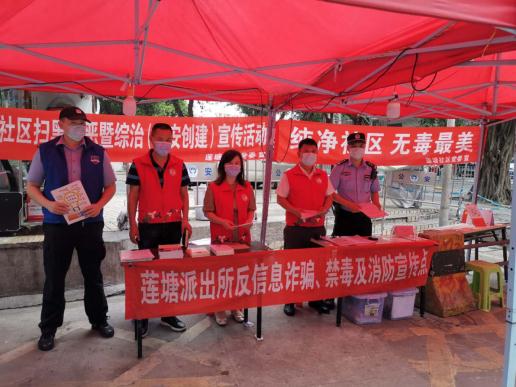 莲塘社区讯:为进一步提升辖区的防诈骗犯罪常识及禁毒宣传知识,2020年5月12日下午,莲塘社区党委书记王建平、社区警长罗柏根、社区工作站网格员及社区工作人员在莲塘村六巷路口开展扫黑除恶、防诈骗、禁毒宣传等活动。