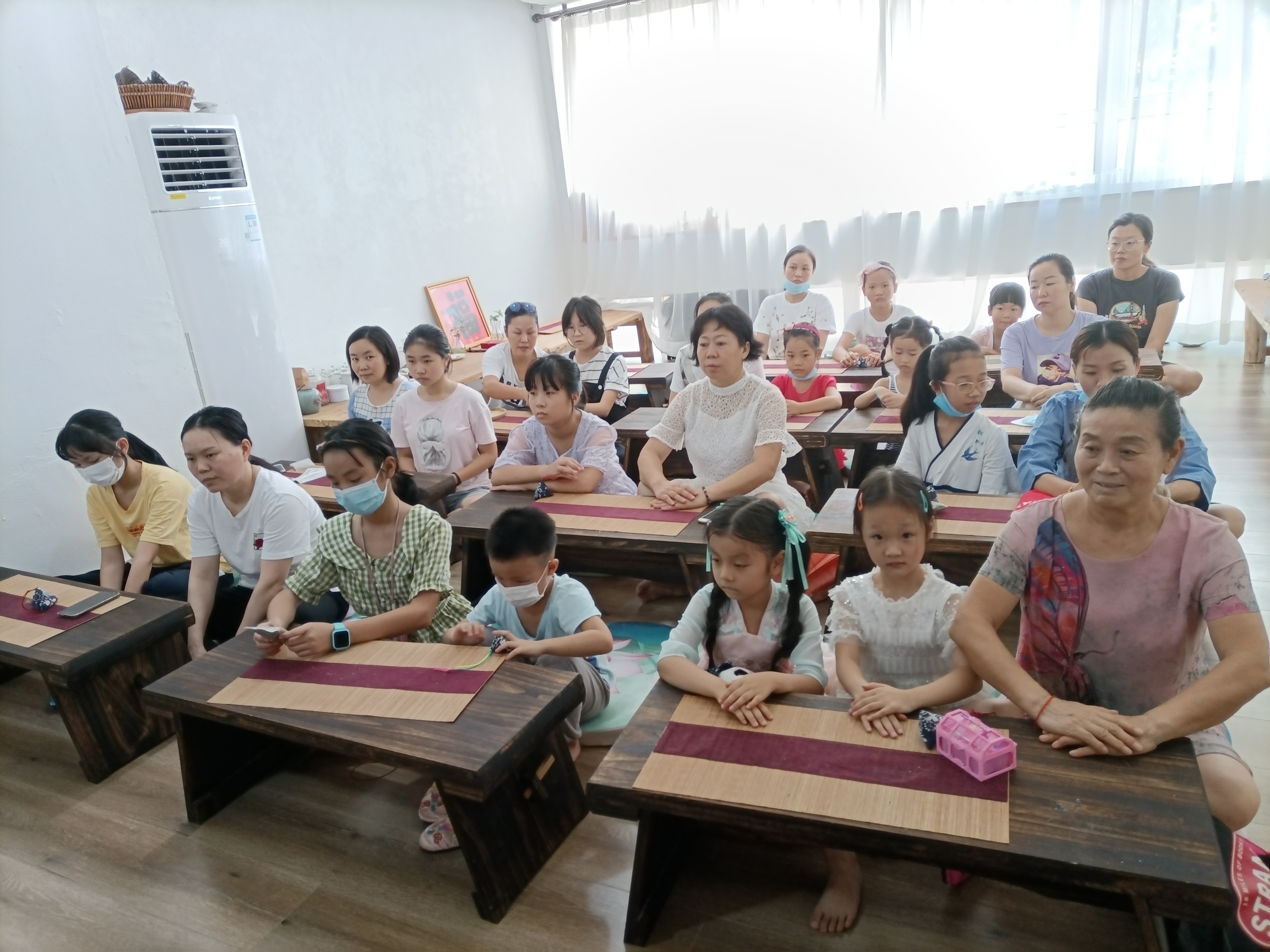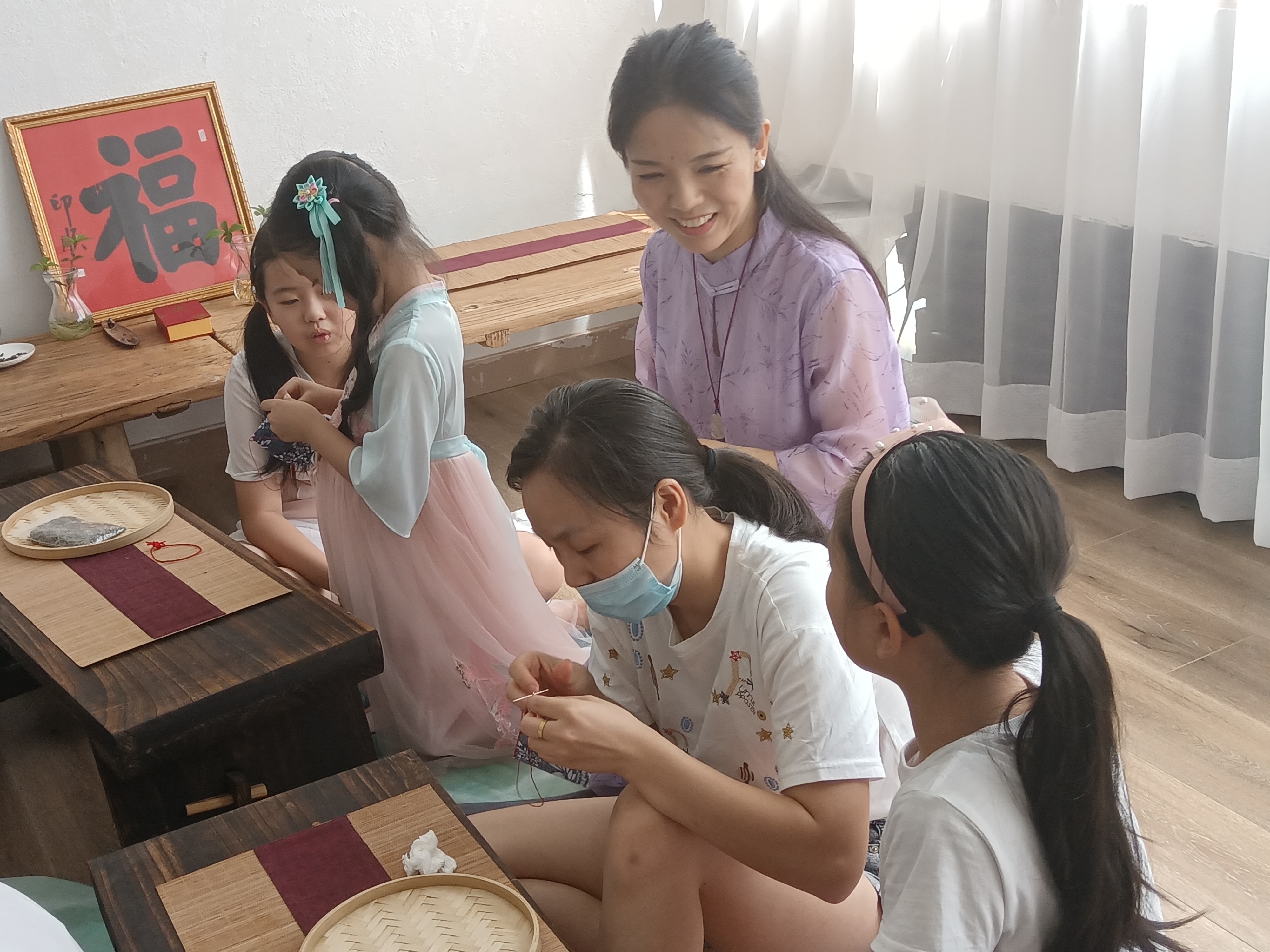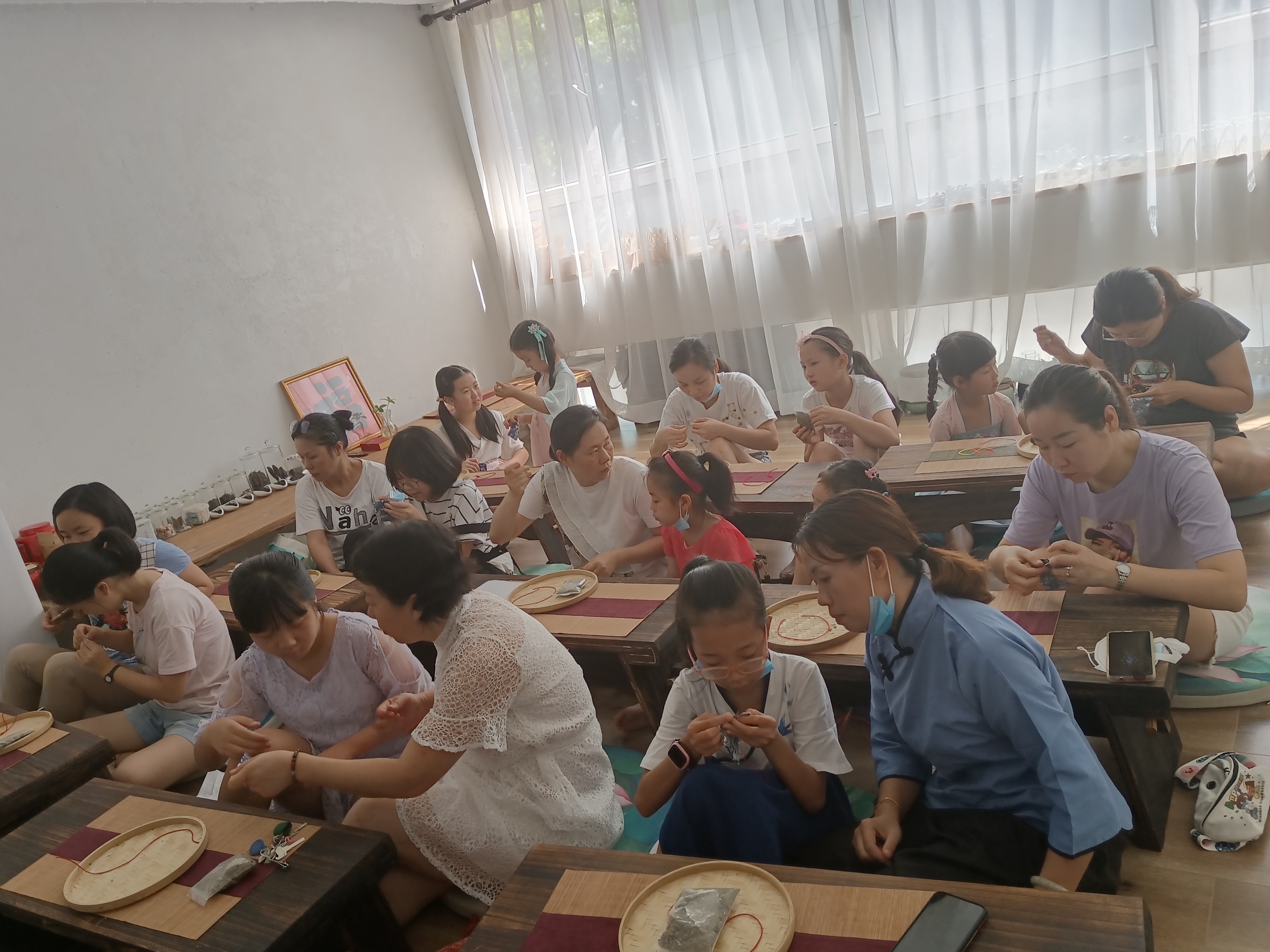 学习完香囊的种类和由来,我们就开始制作香囊啦!杨老师先是给大家详细讲解了香囊的由来和各地习俗。然后便带着大家一起动手,做起了最时尚的防疫香囊。一针,一线,一块布,两个棉球,十二味草药……人手一份,说干就干。杨老师现场演示,学员们亲子携手,穿针引线,密密缝制,收线、打结、断线、翻折、装药、封口、隐线、嵌绳、串珠、结绳……每一步都是一个考验。不到一个小时,大家都顺利完成了自己的作品。