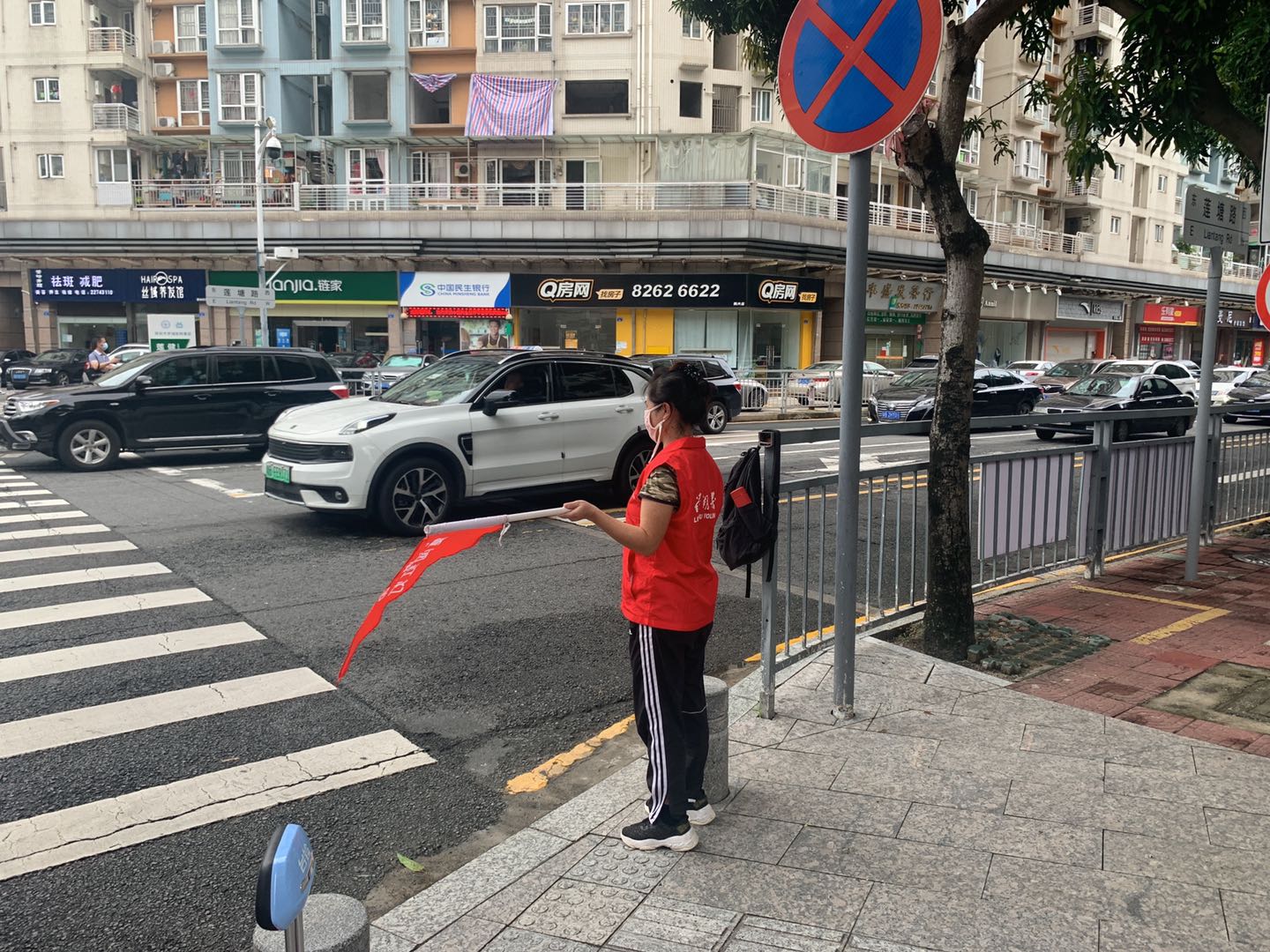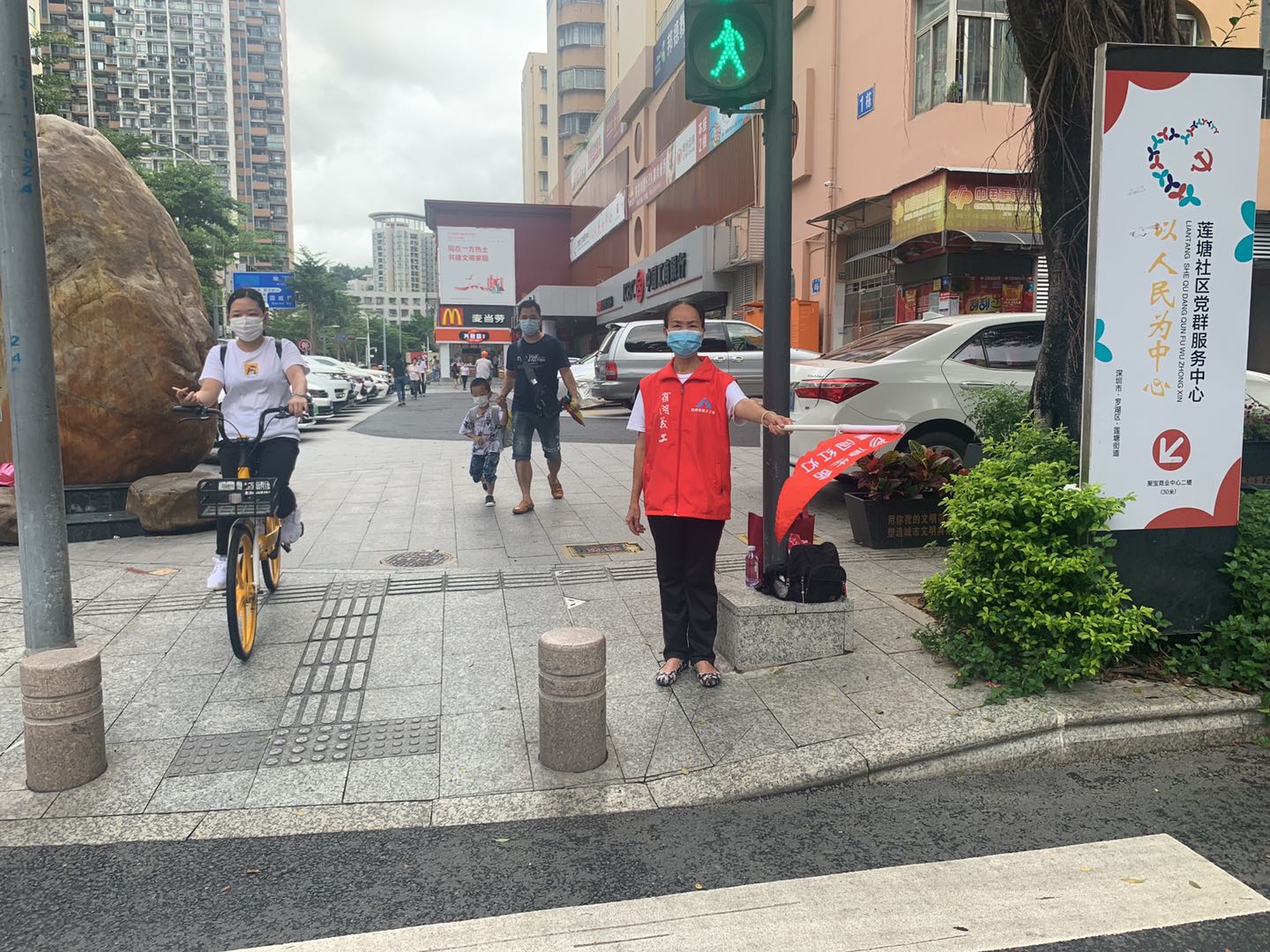 在活动现场,志愿者们身穿义工红马甲,在莲塘路和聚宝路的交叉路口开展文明交通劝导,对闯红灯的行人和右拐车辆不让行人、电动车驾驶员不佩戴头盔等不文明现象进行劝导,号召和动员大家自觉遵守交通安全法律法规,积极参与到文明城市创建活动中来,以实际行动为深圳加油!