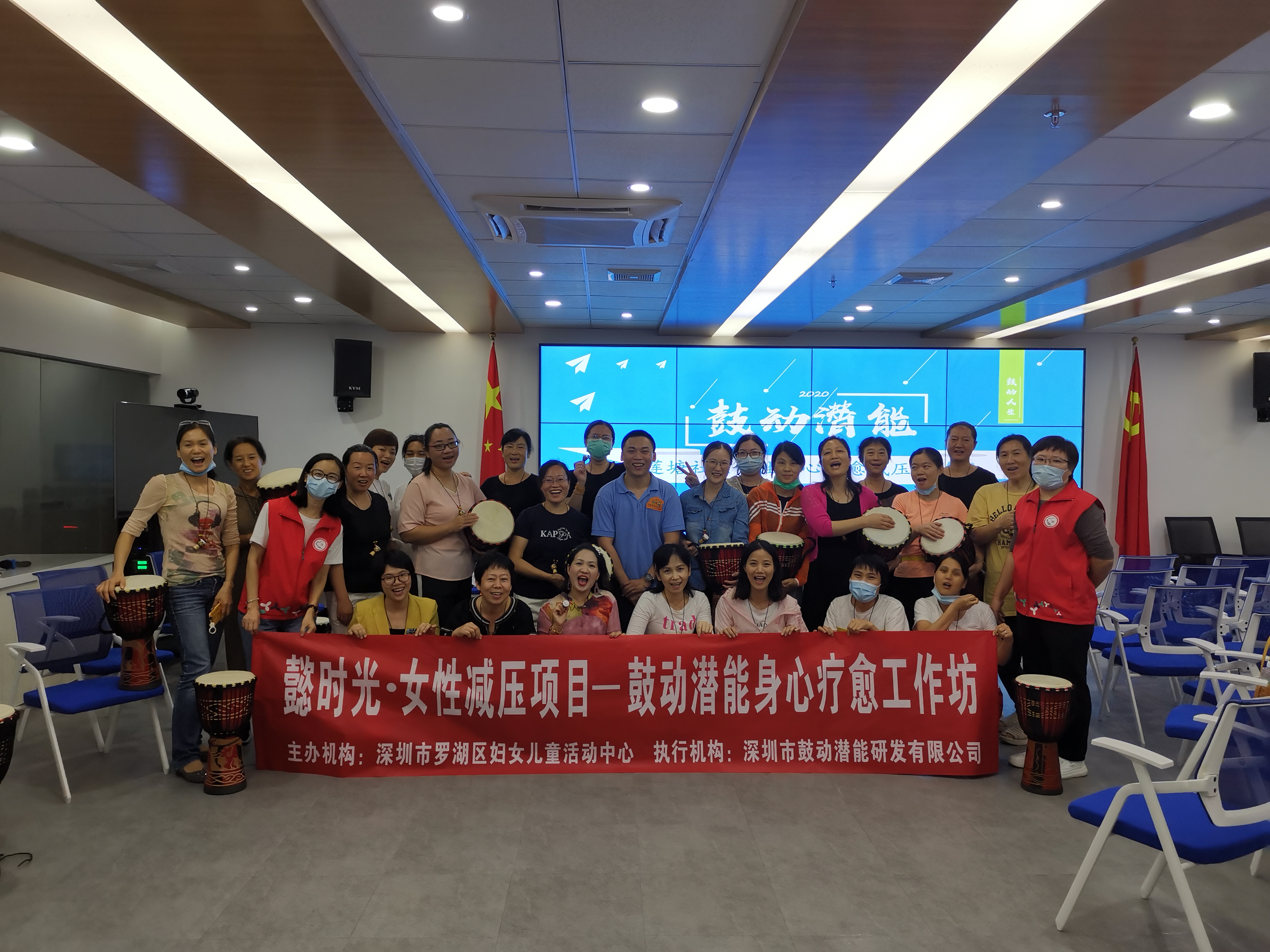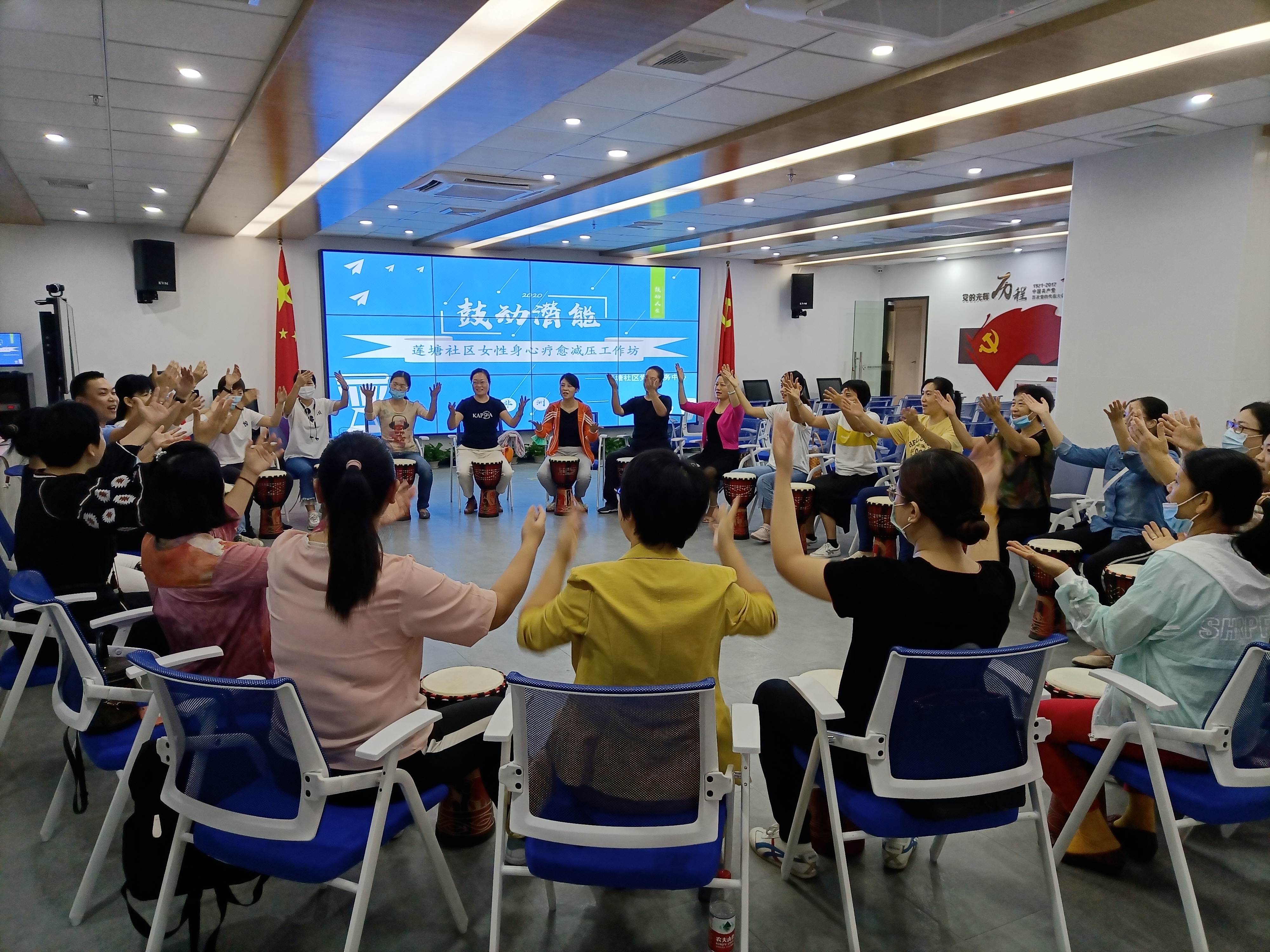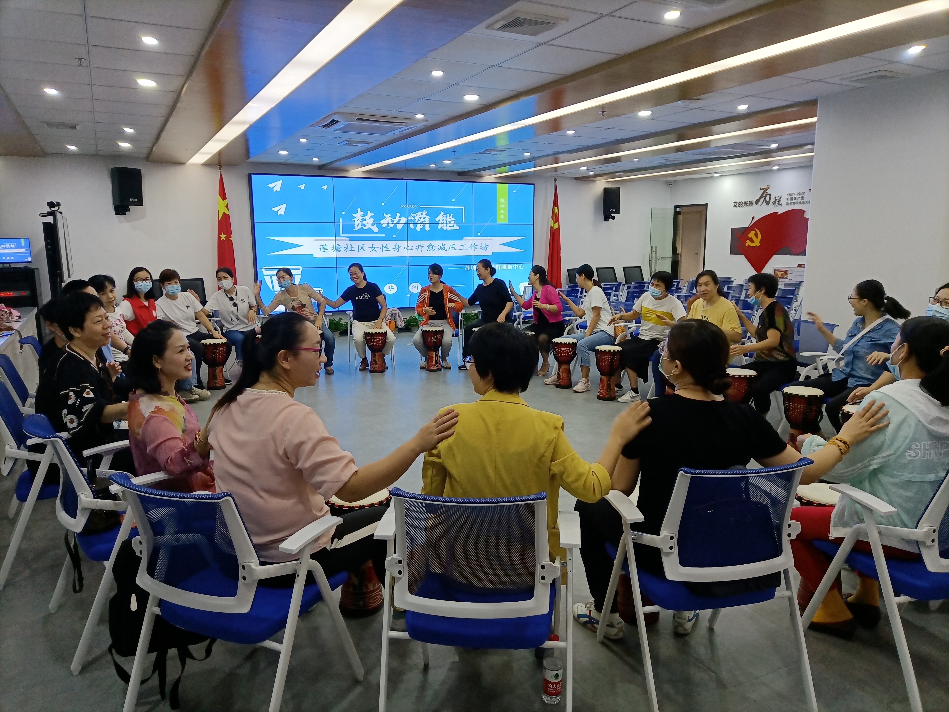 莲塘社区讯:2020年11月20日上午,在莲塘社区党委的大力支持下,深圳市温馨社工服务中心携手罗湖区妇女联合会在新建成的莲塘社区服务中心共同策划开展了“鼓动潜能-莲塘社区女性身心疗愈减压工作坊”非洲鼓减压活动。本次非洲鼓为减压主题活动,旨在通过链接公益资源,整合多方力量,共同为社区居民打造舒缓情绪、减轻压力的港湾,让社区党群活动中心成为居民群众共同的家。