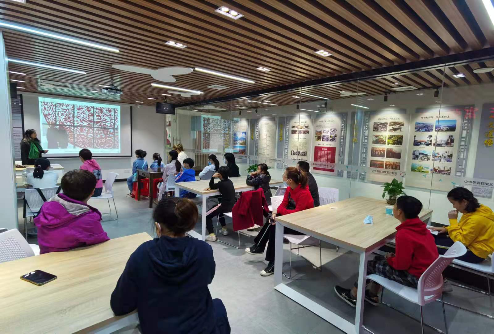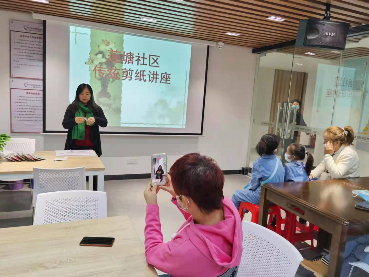12月6日,田氏剪纸省级非遗代表性传人田星老师来到在莲塘社区党群服务中心举行的非遗学堂亲子剪纸课堂,为前来参加活动的15对亲子家庭举办讲座和现场教授剪纸。