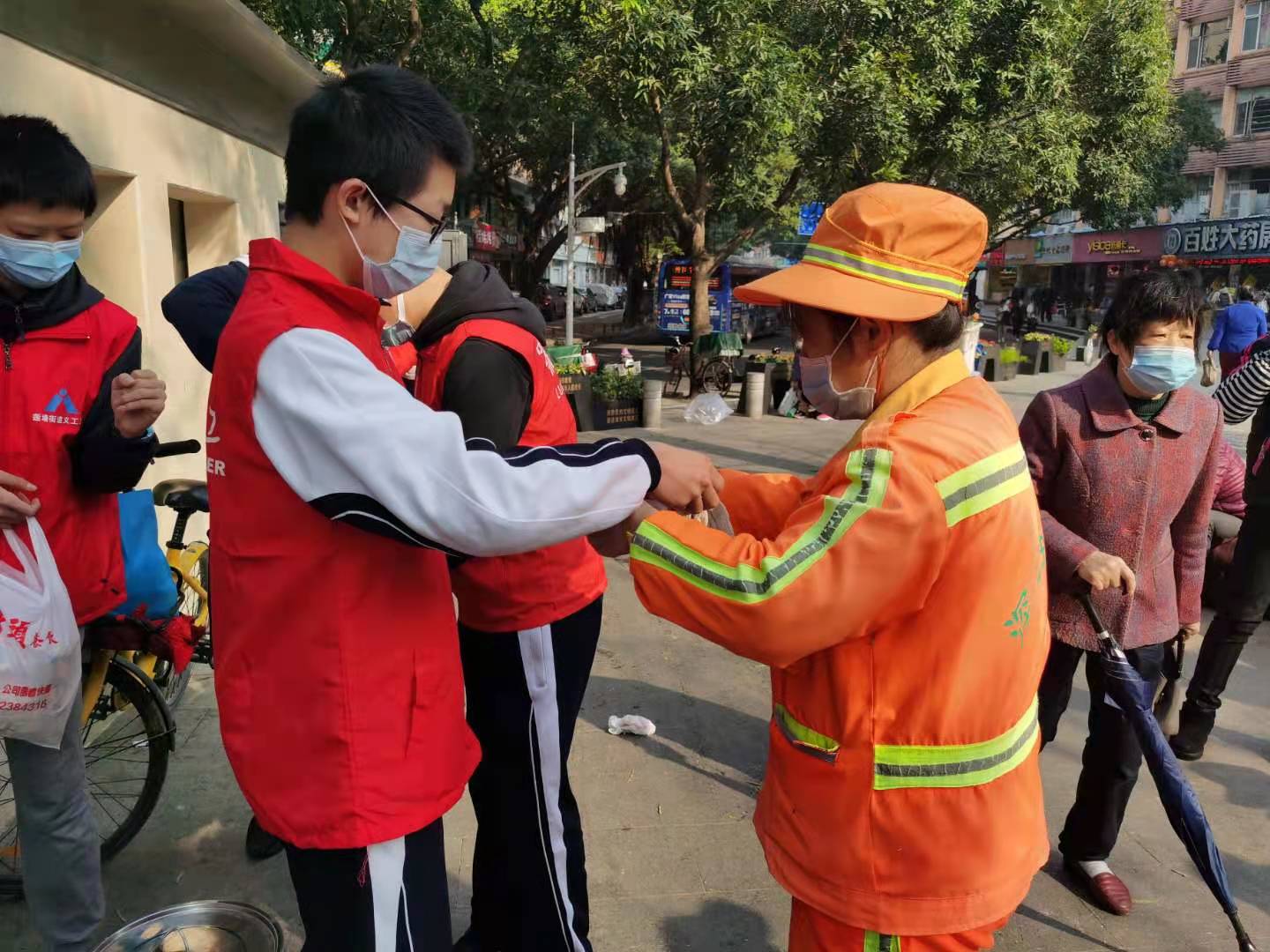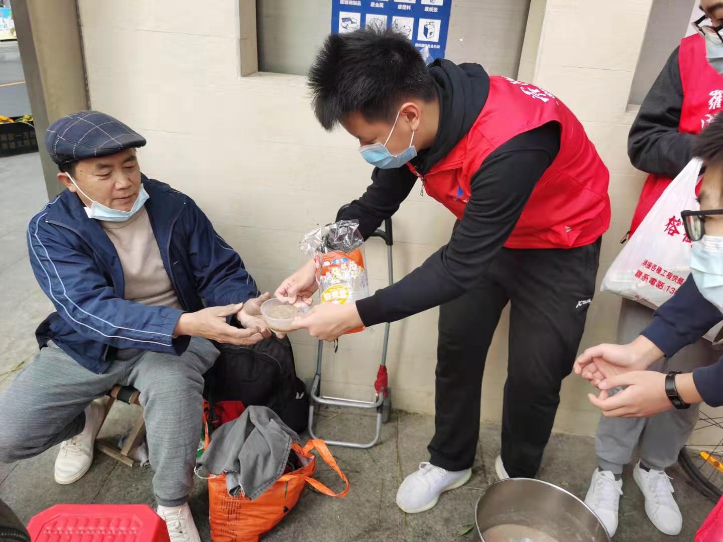 社区工作人员还带领青少年义工抬着腊八粥到社区各个角落去派送。青少年义工和社区工作人员将一碗碗热腾腾的腊八粥送给路边辛勤工作的环卫工人、保安、外卖员手中,传递着社区的温情和暖意。