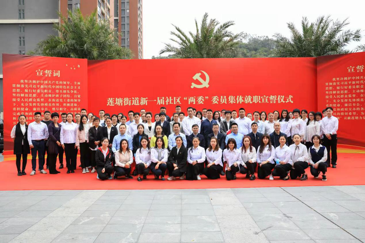 莲塘社区新任“两委”委员参加仪式,在党旗国旗下宣誓:坚决维护中国共产党的领导,全面贯彻落实习近平新时代中国特色社会主义思想,履行好委员职责,带头创先争优,廉洁奉公,恪尽职守,不辜负党和人民的殷切希望。莲塘街道党工委书记叶爱权、莲塘街道办事处主任钟皓分别为新当选的社区党委书记、居委会主任颁发证书。