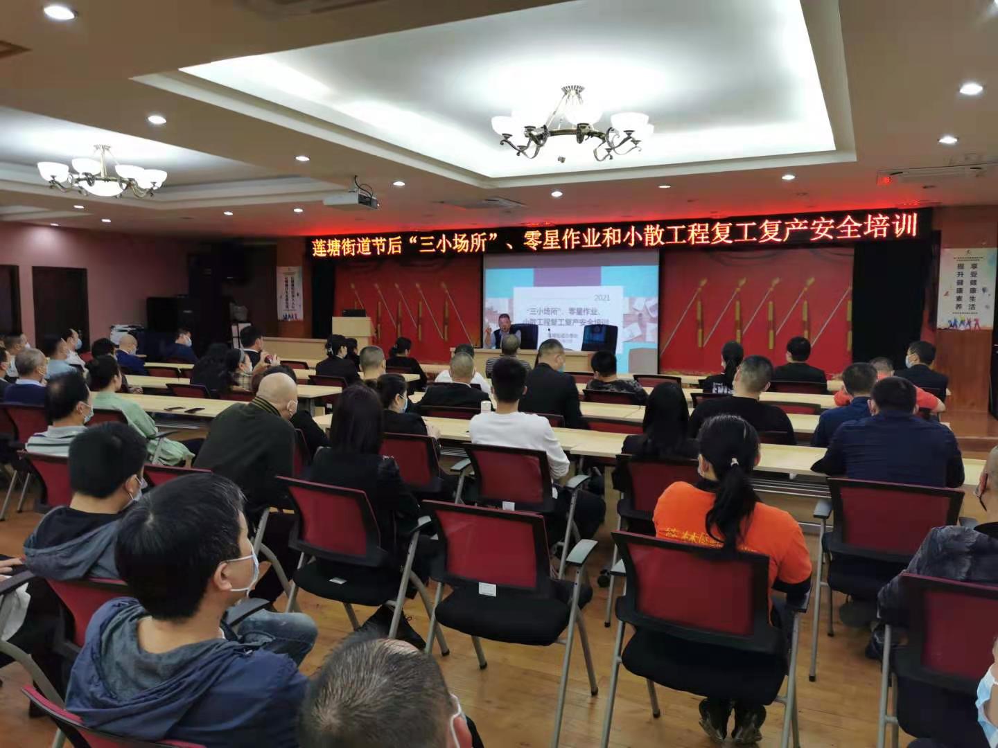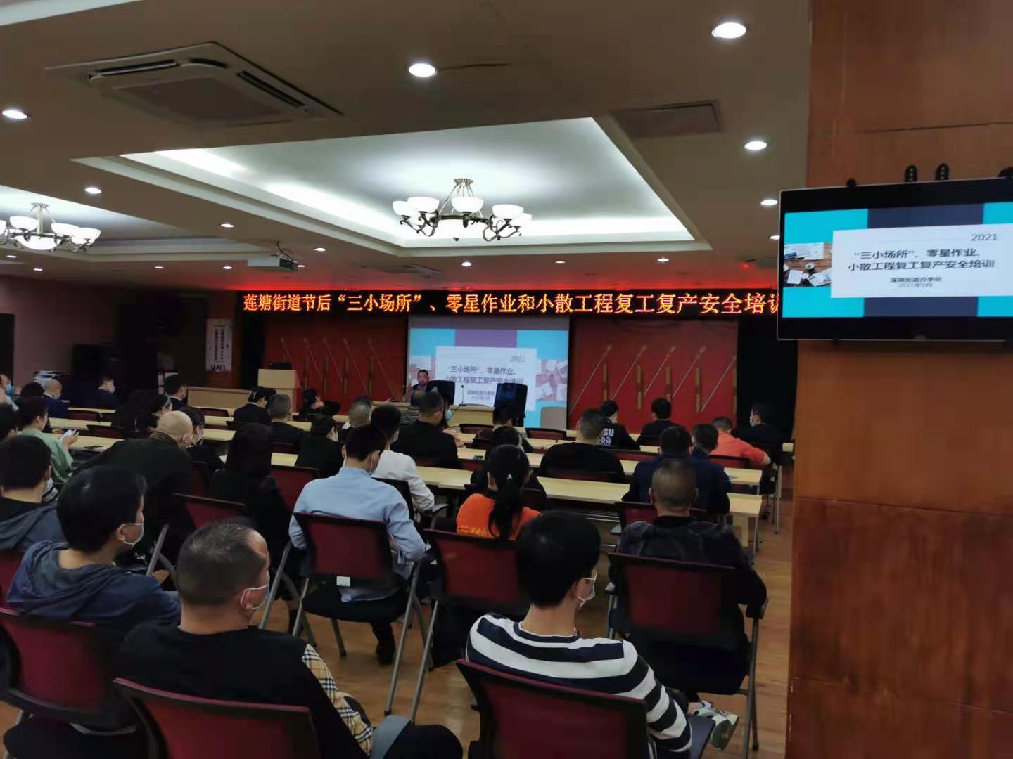 莲塘社区讯:为深入贯彻落实中央、省、市和区政府关于安全生产工作的重要指示批示精神,进一步压实属地管理责任、部门行业监管责任和企业主体责任,切实提高隐患排查治理水平,牢牢守住不发生重特大事故的底线,全面落实和加强春节后安全生产工作,2021年3月9日下午,在莲塘街道A会议室,召开莲塘街道节后“三小场所”、零星作业和小散工程复工复产安全培训会议。
