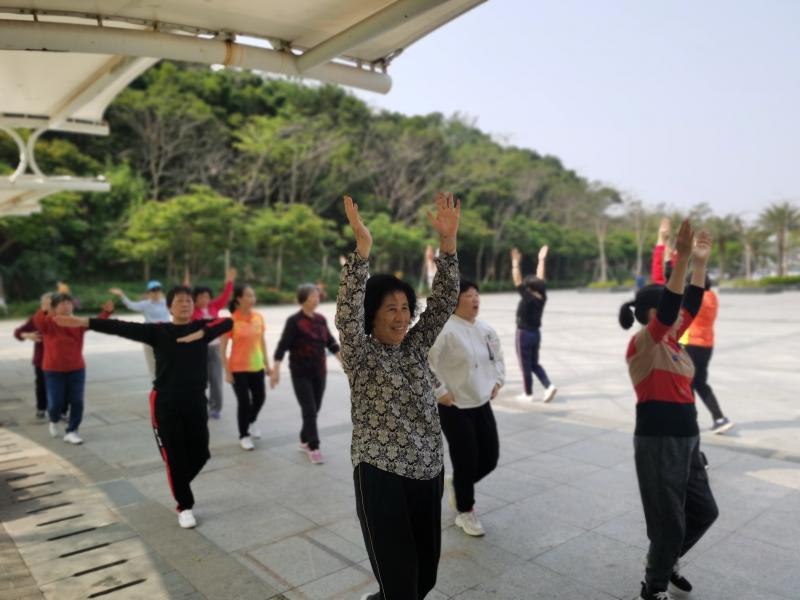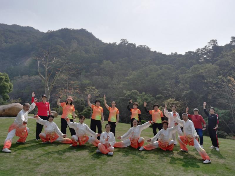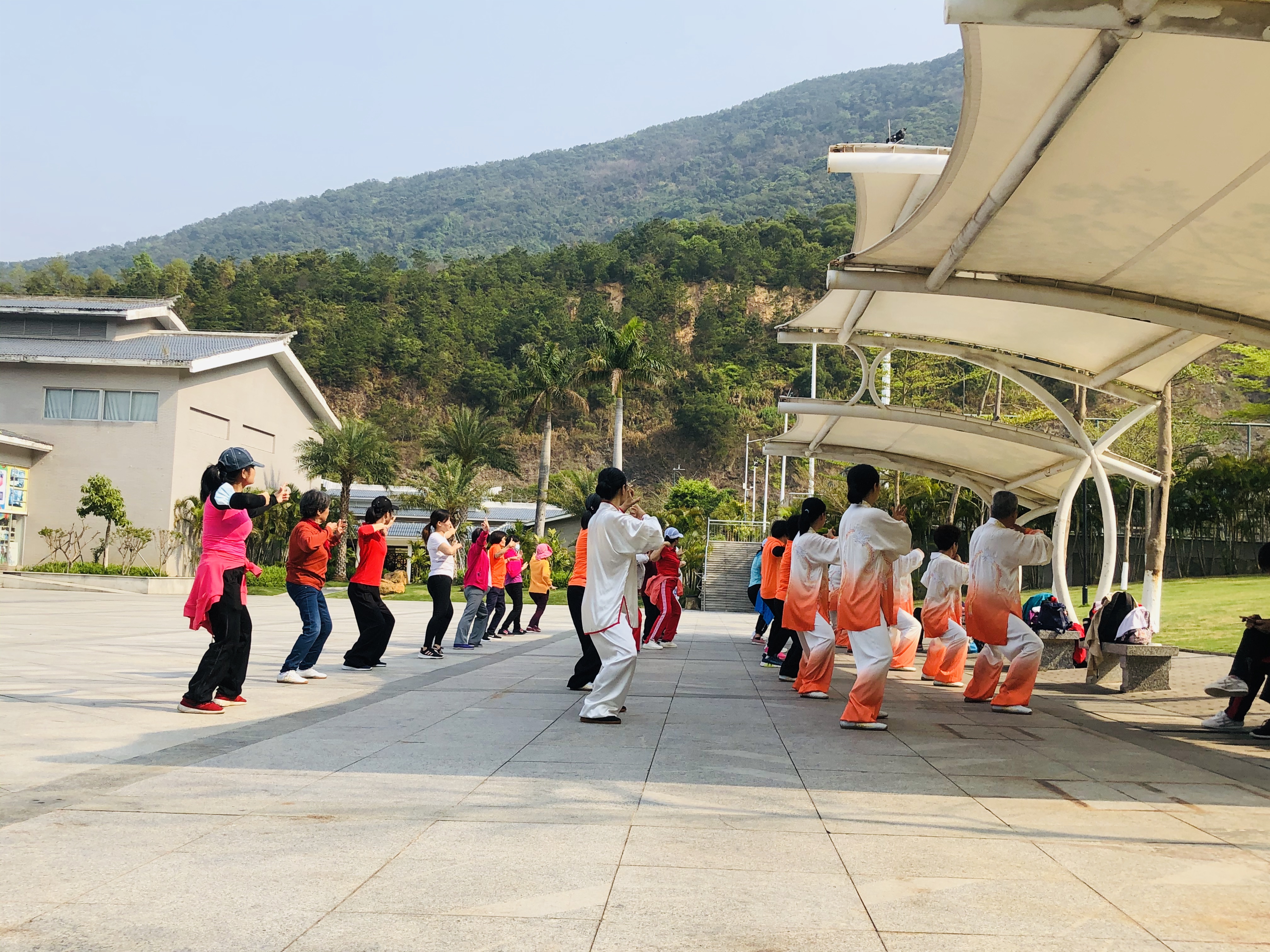 上午9点,社区的24位老人在社工们的陪同下,途步来到仙桐体育公园,蓝天白云下,悠扬的旋律中,鹤发童颜的老人们打起了太极拳,一招一式,一呼一吸,轻灵圆活、刚柔相济。莲塘太极队的老人们的风采吸引了游客的目光。