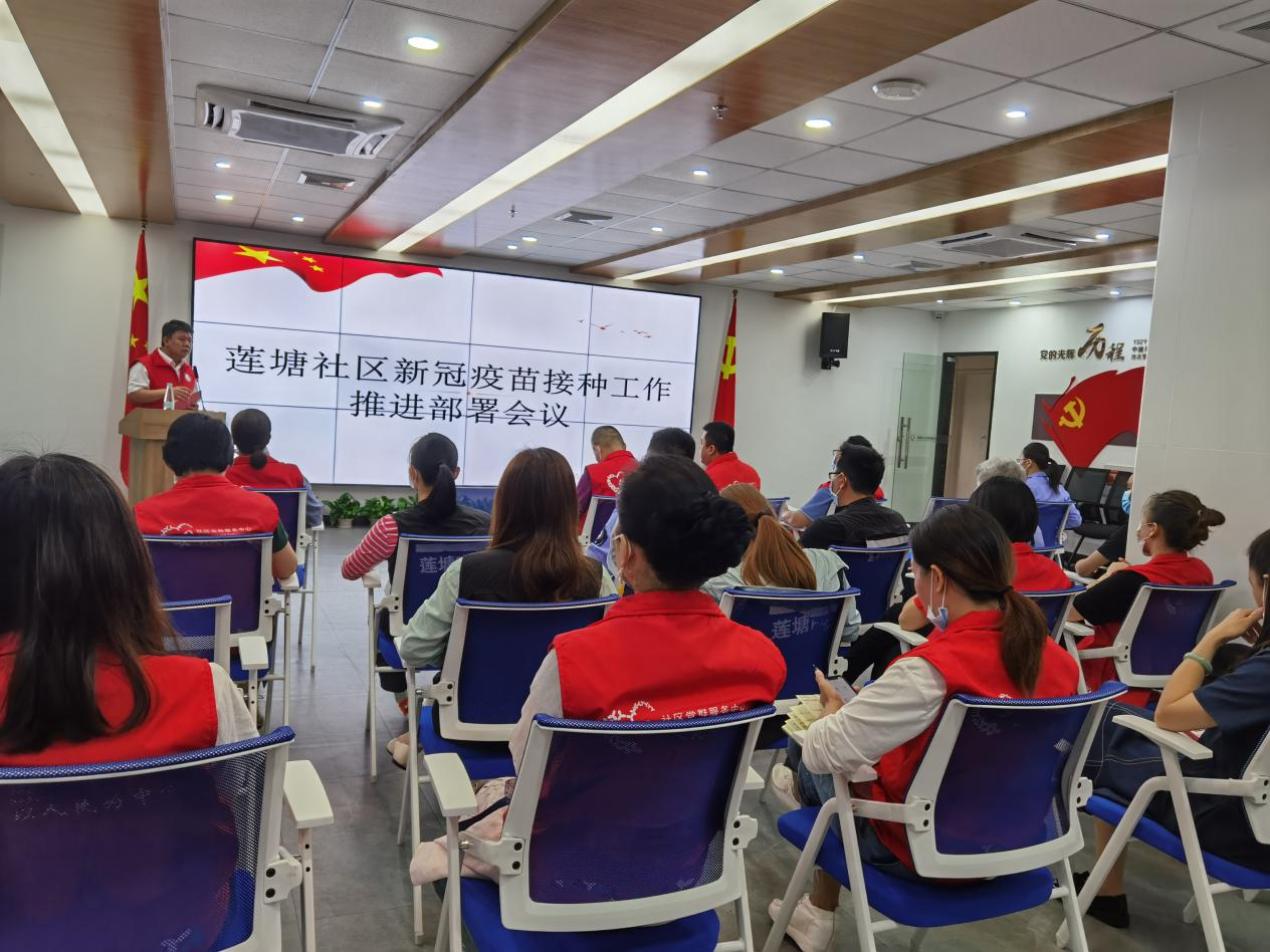 莲塘社区党委书记王建平在会议上强调社区全体工作人员要全面广泛宣传,通过电话、微信、电子屏幕或者上门等方式全面发动辖区符合条件的居民进行疫苗接种,协调各相关部门做好辖区接种人群的宣传动员、摸底登记和人员组织,每日报送人员发动和接种情况,科学有序推进辖区居民疫苗接种。